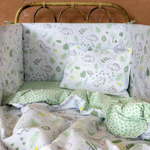 Βρεφικό κουβερλί για την κούνια από την εταιρεία Nima, ιδανικό για αγοράκια. Η βάση είναι λευκή με δεινόσαυρους και πράσινες λεπτομέρειες. Η σύνθεση του εξωτερικού υφάσματος είναι 100% βαμβάκι 144 κλωστών και εσωτερικά έχει λεπτή πολυεστερική βάτα. Η μία μεριά του έχει το σχέδιο του πανωσέντονου και η άλλη το σχέδιο του κατωσέντονου. Διατίθεται σε υφασμάτινη συσκευασία.