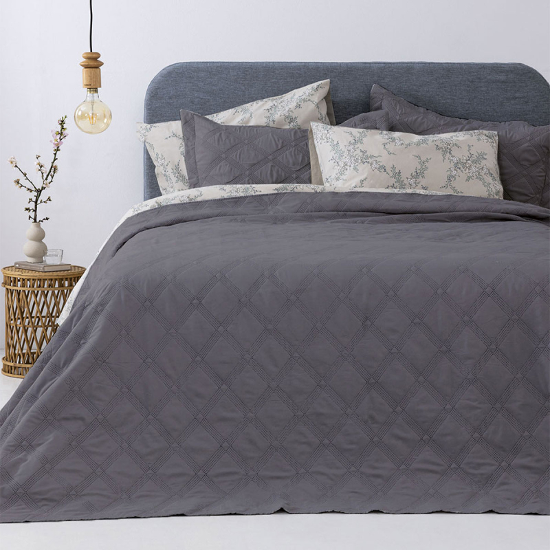 Μονό κουβερλί σε σκούρο γκρι χρώμα και ανάγλυφες λεπτομέρειες από την εταιρεία Palamaiki. Εξωτερικά έχει ύφασμα από 100% microfiber και εσωτερικά έχει λεπτή πολυεστερική βάτα. Στο σετ περιλαμβάνεται και η μαξιλαροθήκη με περιμετρικό πλαίσιο (τύπος Oxford). Ιδανικό σκέπασμα για τους ανοιξιάτικους και φθινοπωρινούς μήνες.