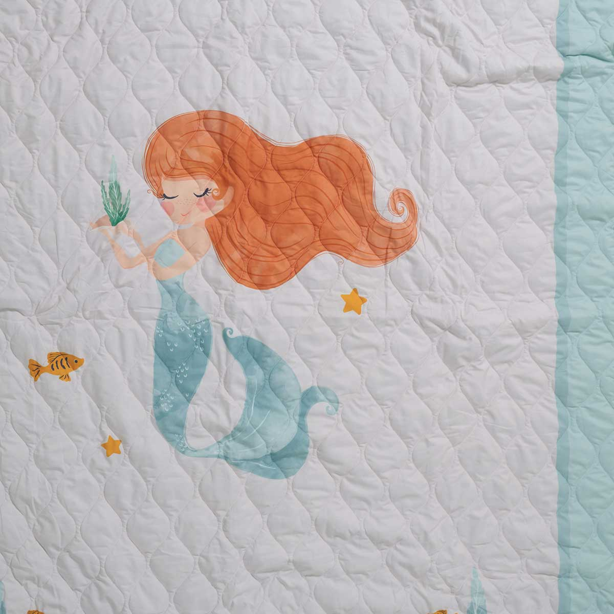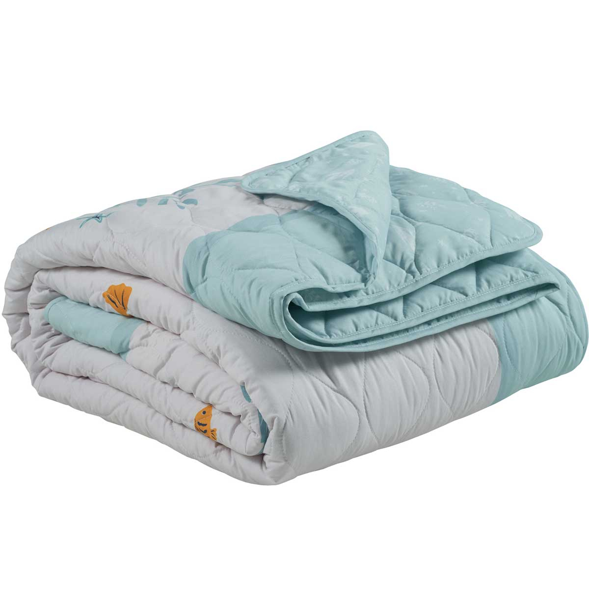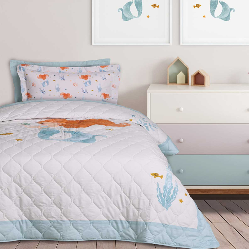 Παιδικό κουβερλί σε γαλάζιο φόντο, με πορτοκαλί λεπτομέρειες και σχέδιο γοργόνες από την εταιρεία Das Home. Η εξωτερική του σύνθεση είναι από 100% υποαλλεργικό microfiber, ενώ γέμιση είναι από πολυεστερική βάτα. Ιδανικό καλοκαιρινό σκέπασμα για το παιδικό δωμάτιο που μπορεί να χρησιμοποιηθεί και σαν διακοσμητικό στοιχείο στρωμένο στο κρεβάτι. Συνδυάστε το, με τα υπόλοιπα είδη της ίδιας σειράς για ένα ολοκληρωμένο αποτέλεσμα.