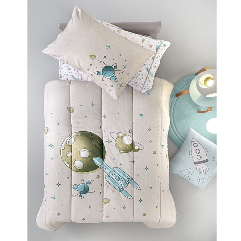 Κουβερλί μονό με σχέδιο διάστημα σε μπεζ φόντο και βεραμάν-μουσταρδί λεπτομέρειες από την εταιρεία Guy Laroche. Το εξωτερικό ύφασμα είναι από 100% microsuede και εσωτερικά έχει λεπτή πολυεστερική βάτα. Ιδανικό σκέπασμα για την άνοιξη και το καλοκαίρι. Συνδυάστε το με τα υπόλοιπα είδη της ίδιας σειράς για ένα ολοκληρωμένο αποτέλεσμα.