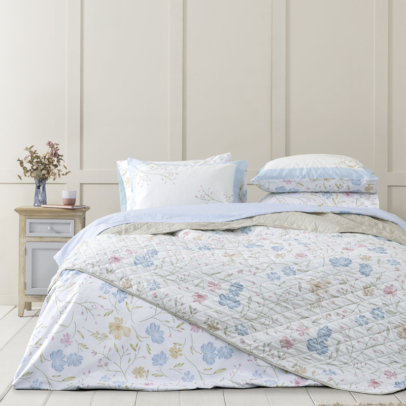Μονό κουβερλί από την εταιρεία Nima. Το ύφασμα είναι 100% microfiber, εσωτερικά έχει λεπτή πολυεστερική βάτα, που το καθιστά ιδανικό σκέπασμα για τους ανοιξιάτικους και καλοκαιρινούς μήνες. Η μία μεριά σε γαλάζιο χρώμα με πουά σχέδιο, ενώ η άλλη είναι σε λευκό φόντο και φλοράλ σχέδιο. Συνδυάστε το με τα υπόλοιπα είδη του ίδιου σχεδίου για ένα ολοκληρωμένο αποτέλεσμα.
