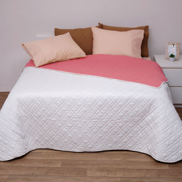 Μονό κουβερλί από την εταιρεία Viopros. Έχει ανάγλυφο σχέδιο με την μία πλευρά σε εκρού χρώμα και την άλλη σε ροζ. Η σύνθεσή του εξωτερικού υφάσματος είναι από 100% microfiber που το καθιστά ιδιαίτερα απαλό ενώ η γέμιση είναι από πολυεστερική βάτα, βάρους 150gsm. Ιδανικό σκέπασμα για τους καλοκαιρινούς-ανοιξιάτικους μήνες.