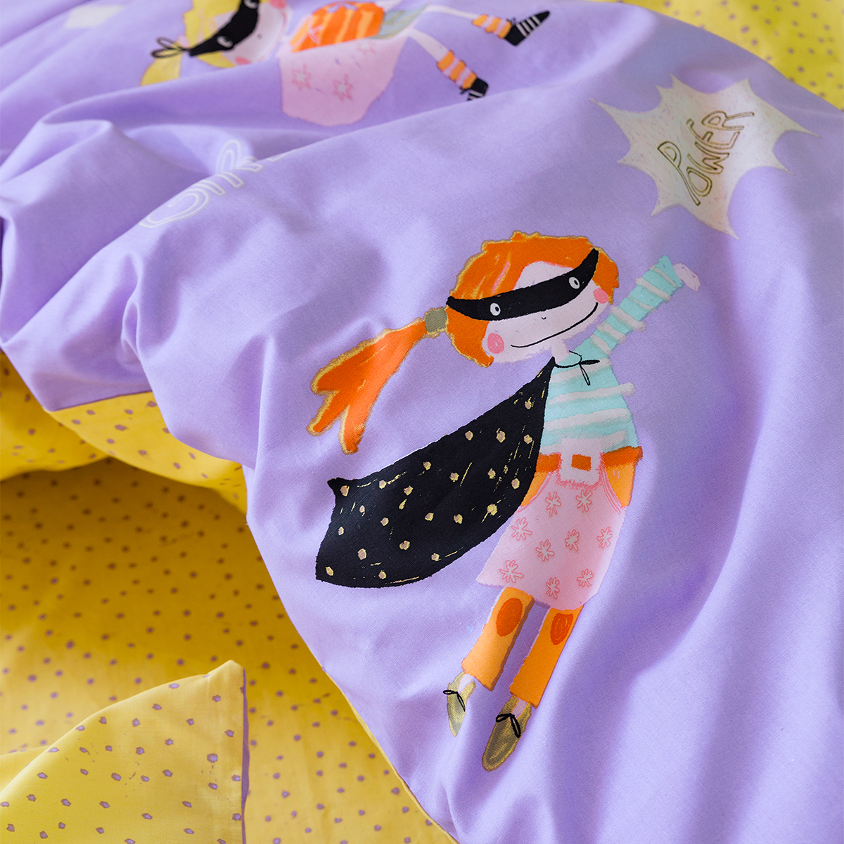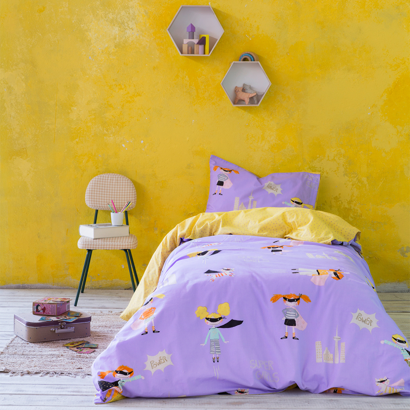 Μονό κουβερλί από την εταιρεία Nima για το παιδικό δωμάτιο. Το εξωτερικό ύφασμα είναι 100% βαμβάκι 144 κλωστών και εσωτερικά έχει λεπτή πολυεστερική βάτα σε λιλά χρώμα με πολύχρωμες λεπτομέρειες και σχέδιο παιδικές φιγούρες. Η μία μεριά έχει το σχέδιο του πανωσέντονου και η άλλη το σχέδιο του κατωσέντονου. Διατίθεται σε υφασμάτινη συσκευασία.