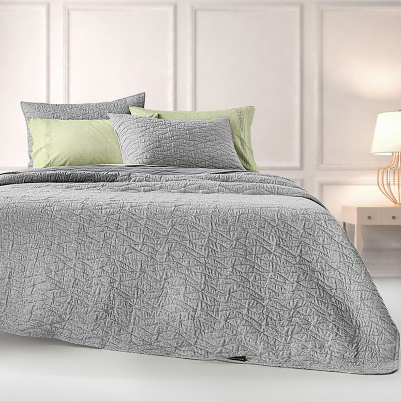 Υπέρδιπλο κουβερλί με καπιτονέ σχέδιο από την εταιρεία Guy Laroche σε γκρι χρώμα. Το εξωτερικό ύφασμα είναι από 100% microfiber ενώ εσωτερικά διαθέτει λεπτή πολυεστερική βάτα, που το καθιστά ιδανικό για την άνοιξη και το καλοκαίρι. Η συσκευασία του κουβερλί είναι η διακοσμητική μαξιλαροθήκη.