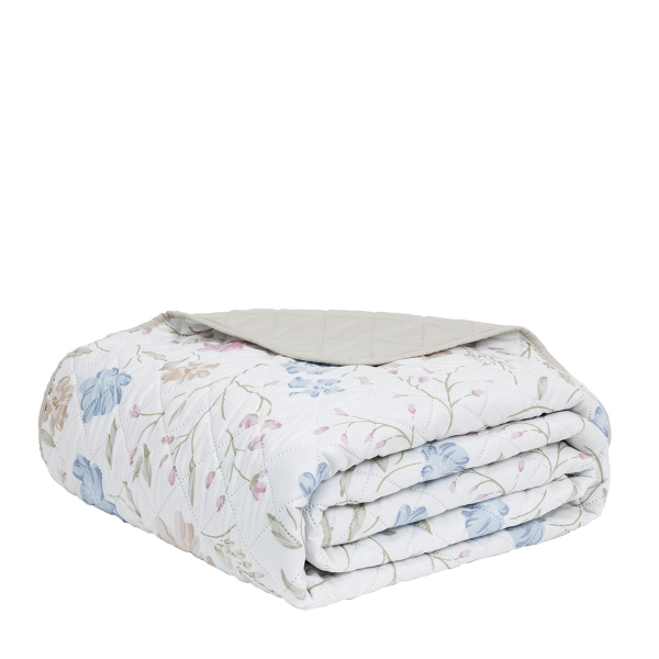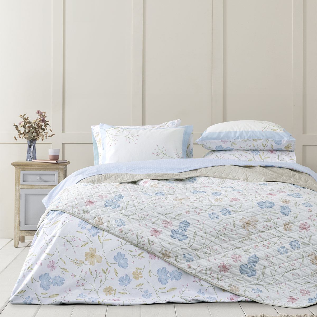 Υπέρδιπλο κουβερλί από την εταιρεία Nima. Το ύφασμα είναι 100% microfiber, εσωτερικά έχει λεπτή πολυεστερική βάτα, που το καθιστά ιδανικό σκέπασμα για τους ανοιξιάτικους και καλοκαιρινούς μήνες. Η μία μεριά σε γαλάζιο χρώμα με πουά σχέδιο, ενώ η άλλη είναι σε λευκό φόντο και φλοράλ σχέδιο. Συνδυάστε το με τα υπόλοιπα είδη του ίδιου σχεδίου για ένα ολοκληρωμένο αποτέλεσμα.
