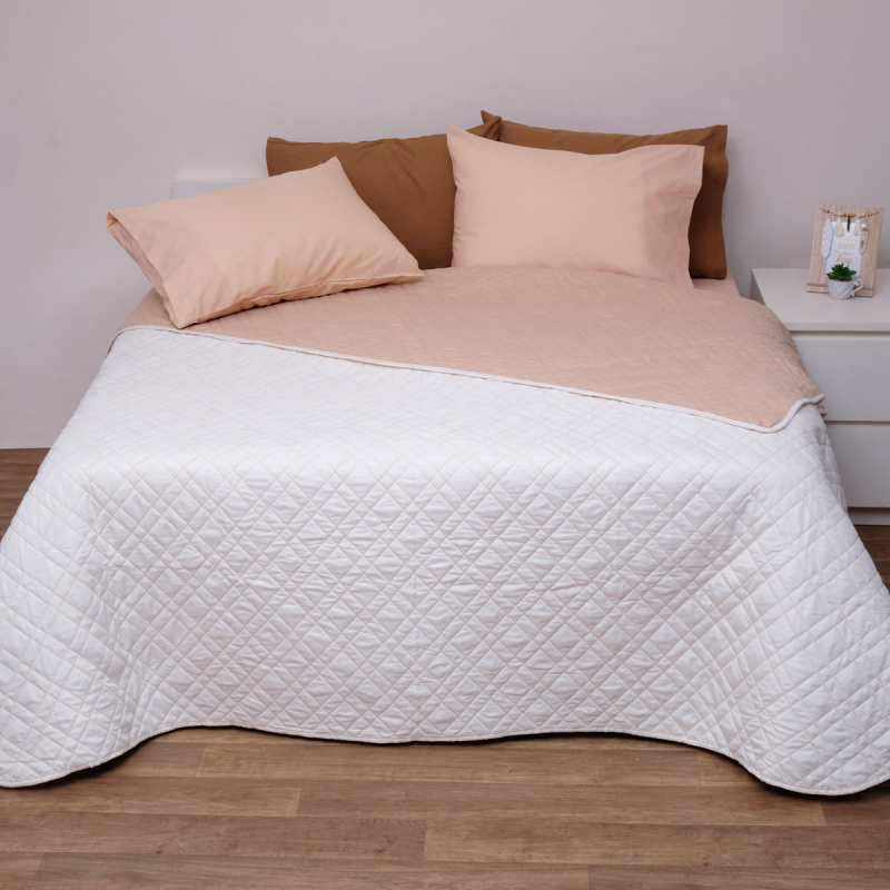 Υπέρδιπλο κουβερλί από την εταιρεία Viopros. Έχει ανάγλυφο σχέδιο με την μία πλευρά σε εκρού χρώμα και την άλλη σε μπεζ. Η σύνθεσή του εξωτερικού υφάσματος είναι από 100% microfiber που το καθιστά ιδιαίτερα απαλό ενώ η γέμιση είναι από πολυεστερική βάτα, βάρους 150gsm. Ιδανικό σκέπασμα για τους καλοκαιρινούς-ανοιξιάτικους μήνες.