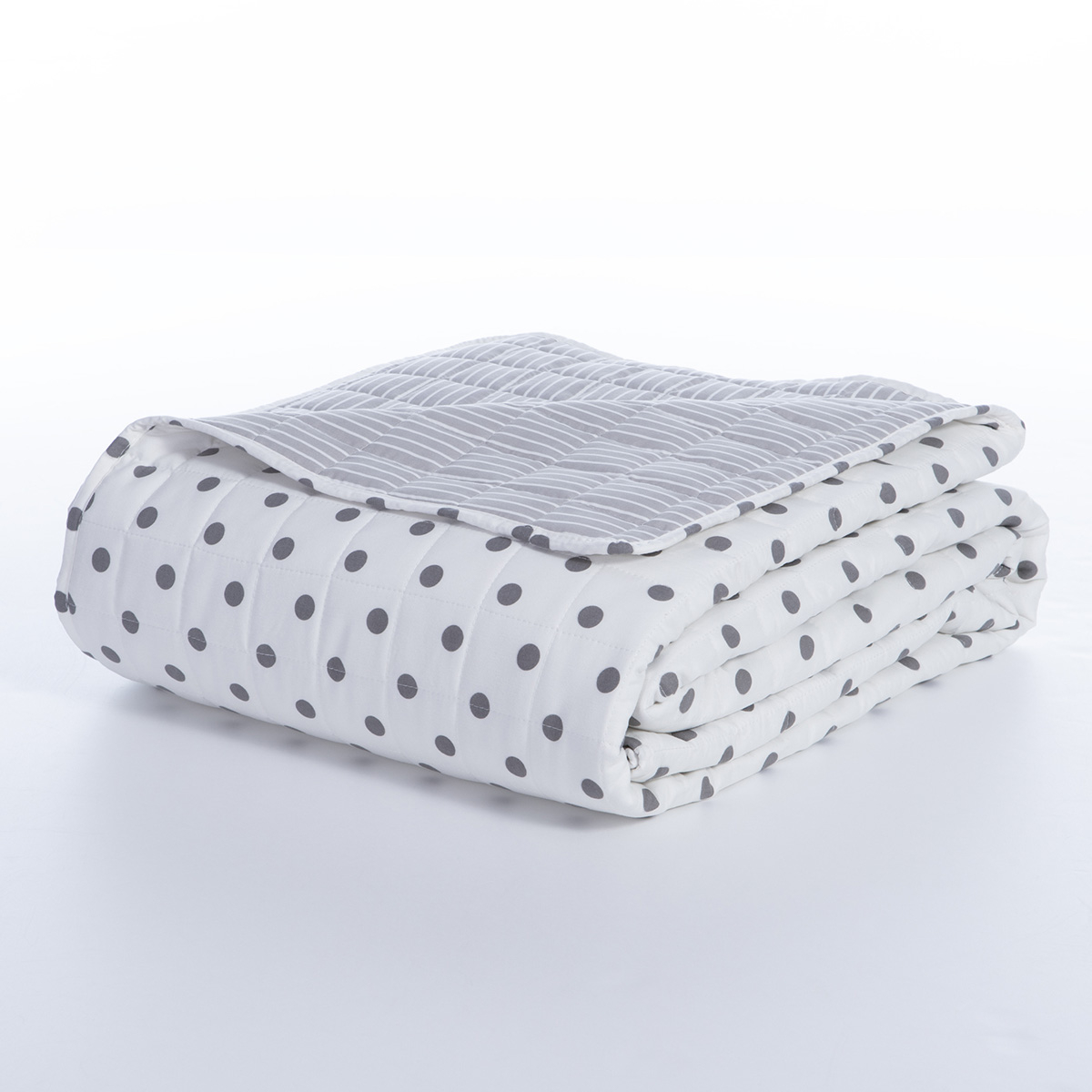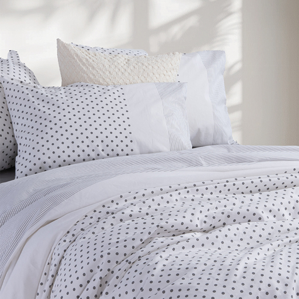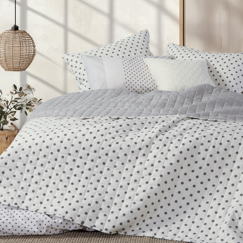 Υπέρδιπλο κουβερλί από την εταιρεία Nef-Nef σε λευκό χρώμα με γκρι πουά. Το ύφασμα είναι από 100% microfiber βάρους 80gsm ενώ η γέμιση είναι πολυεστερική βάτα βάρους 150gsm. Το κουβερλί είναι διπλής όψης καθώς από την μία πλευρά έχει το σχέδιο του πανωσέντονου και από την άλλη το σχέδιο του κατωσέντονου. Το συνολικό του βάρος 230gsm το καθιστά ιδανικό σκέπασμα για ανοιξιάτικους και καλοκαιρινούς μήνες. Δώστε στην κρεβατοκάμαρά σας μία ολοκληρωμένη αισθητική, επιλέγοντας και τα υπόλοιπα προϊόντα του ίδιου σετ. Η εταιρεία Nef-Nef διαθέτει πιστοποίηση Oeko-Tex, που εγγυάται ότι τα προϊόντα της είναι απαλλαγμένα από επιβλαβείς χημικές ουσίες.