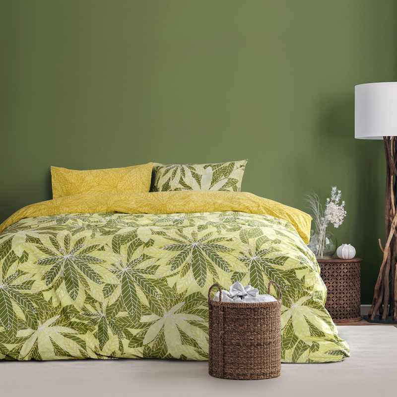 Υπέρδιπλο κουβερλί από την εταιρεία Kocoon με tropical σχέδιο. Το ύφασμα είναι 50% βαμβάκι - 50% polyester 144 κλωστών σε χακί χρώμα με λαχανί λεπτομέρειες. Εσωτερικά έχει λεπτή πολυεστερική βάτα, που το καθιστά ιδανικό σκέπασμα για τους ανοιξιάτικους και καλοκαιρινούς μήνες. Η μία μεριά έχει το σχέδιο του πανωσέντονου και η άλλη το σχέδιο του κατωσέντονου.