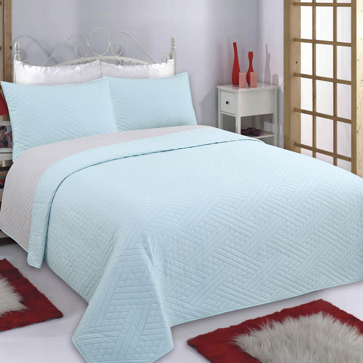 Κουβερλί γίγας από την εταιρεία Silk Fashion. Είναι διπλής όψης με την μια όψη σε γαλάζιο χρώμα και ανάγλυφο σχέδιο και από την άλλη σε γκρι χρώμα. Το εξωτερικό ύφασμα είναι από 100% microcotton που το καθιστά απαλό και ανθεκτικό, ενώ η γέμιση είναι από πολυεστερική βάτα βάρους 120gsm. Στο σετ περιλαμβάνονται και οι μαξιλαροθήκες φάκελος διπλής όψης. Ιδανικό καλοκαιρινό σκέπασμα.