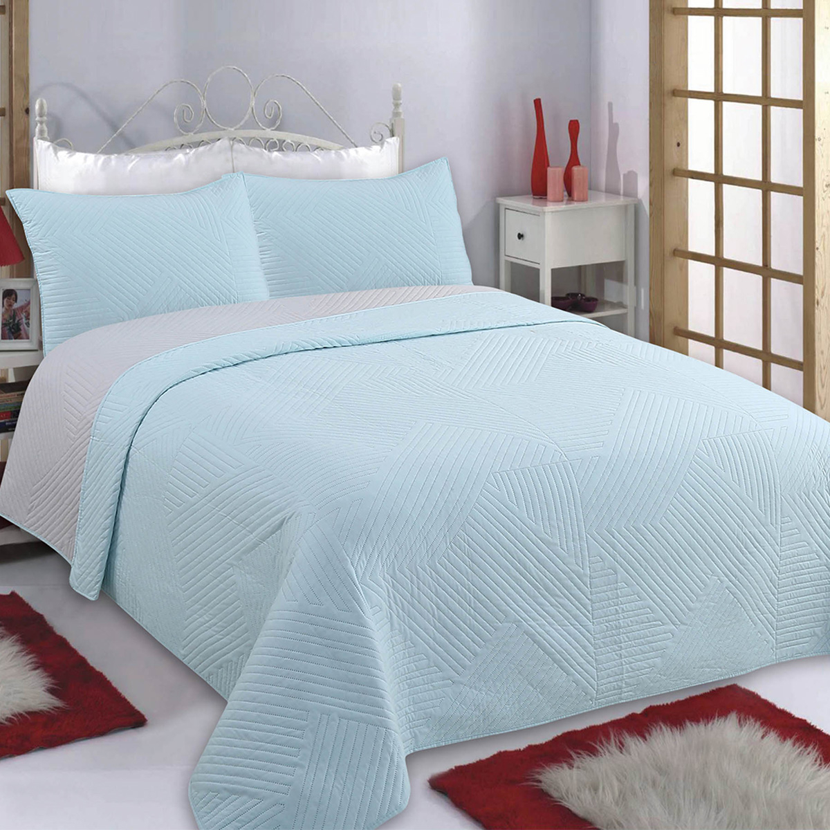 Κουβερλί γίγας από την εταιρεία Silk Fashion. Είναι διπλής όψης με την μια όψη σε γαλάζιο χρώμα και ανάγλυφο σχέδιο και από την άλλη σε γκρι χρώμα. Το εξωτερικό ύφασμα είναι από 100% microcotton που το καθιστά απαλό και ανθεκτικό, ενώ η γέμιση είναι από πολυεστερική βάτα βάρους 120gsm. Στο σετ περιλαμβάνονται και οι μαξιλαροθήκες φάκελος διπλής όψης. Ιδανικό καλοκαιρινό σκέπασμα.