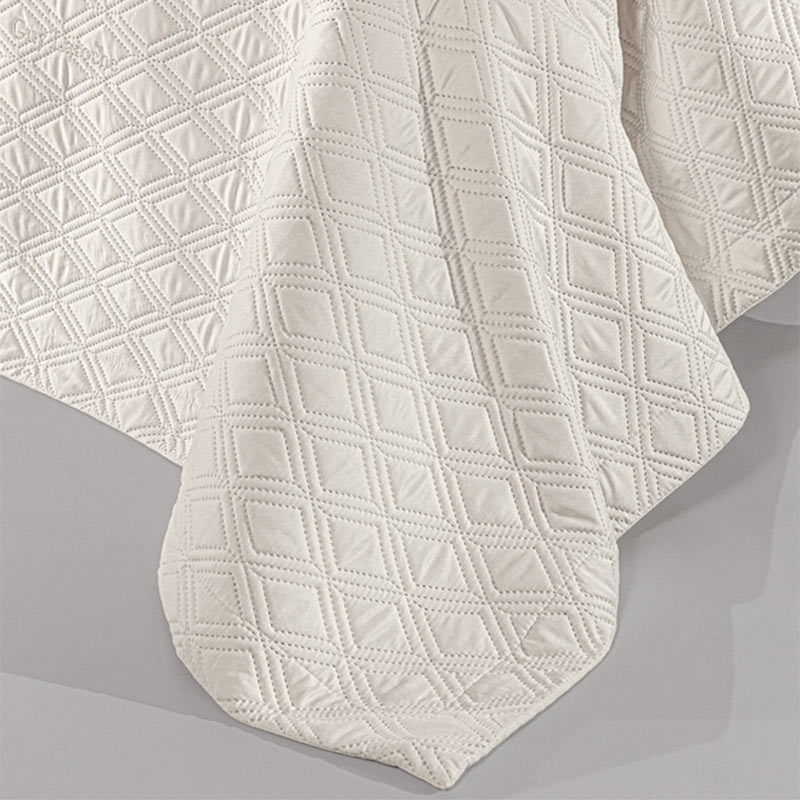 Γίγας κουβερλί σε εκρού χρώμα με σατινέ ανάγλυφη υφή από την εταιρεία Guy Laroche. Το ύφασμα είναι 100% microfiber με πολύ απαλή σατινέ υφή. Εσωτερικά διαθέτει λεπτή πολυεστερική βάτα, που το καθιστά ιδανικό ανοιξιάτικο και καλοκαιρινό σκέπασμα. Οι μαξιλαροθήκες είναι στο σχέδιο του κουβερλί με περιμετρικό πλαίσιο (τύπος oxford). Στολίστε τον χώρο σας με στυλ και ποιότητα.