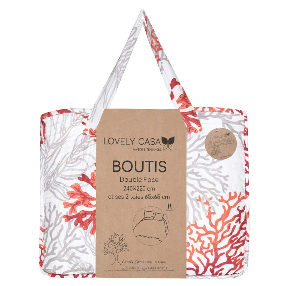 Κουβερλί γίγας διπλής όψης και διακοσμητικές μαξιλαροθήκες. Η μία πλευρά έχει λευκό φόντο, κόκκινες-γκρι λεπτομέρειες και tropical σχέδιο ενώ η άλλη έχει λευκό χρώμα, γκρι-κοραλί λεπτομέρειες και ριγέ σχέδιο. Οι μαξιλαροθήκες είναι διπλής όψης με το σχέδιο από το κουβερλί. Κατασκευασμένο από 100% polyester με γέμιση από λεπτή πολυεστερική βάτα. Ιδανικό σκέπασμα για τους ανοιξιάτικους και φθινοπωρινούς μήνες. Έρχονται σε υφασμάτινη συσκευασία στο ίδιο σχέδιο με το κουβερλί.