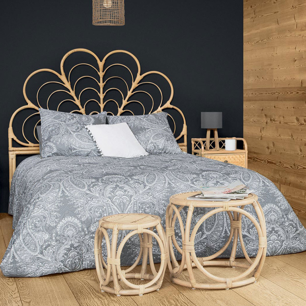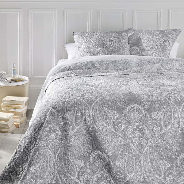 Γίγας κουβερλί διπλής όψης σε γκρι-λευκή απόχρωση με έθνικ σχέδιο. Το εξωτερικό ύφασμα είναι πολυεστερικό και εσωτερικά διαθέτει λεπτή πολυεστερική βάτα. Ιδανικό σκέπασμα για τους ανοιξιάτικους και φθινοπωρινούς μήνες. Περιλαμβάνονται διακοσμητικές μαξιλαροθήκες για ολοκληρωμένο αποτέλεσμα. Προϊόν με ετικέτα OEKO-TEX.