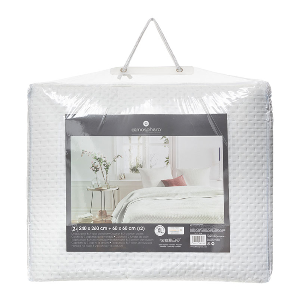 Γίγας κουβερλί με ανάγλυφο σχέδιο σε ιβουάρ χρώμα. Το εξωτερικό ύφασμα είναι από 100% polyester και εσωτερικά διαθέτει λεπτή πολυεστερική βάτα. Ιδανικό σκέπασμα για τους ανοιξιάτικους και φθινοπωρινούς μήνες. Στο σετ περιλαμβάνονται 2 διακοσμητικές μαξιλαροθήκες 60x60 στο ίδιο σχέδιο για ένα ολοκληρωμένο αποτέλεσμα στην κρεβατοκάμαρα σας. Έρχεται σε πλαστική σακούλα αποθήκευσης.