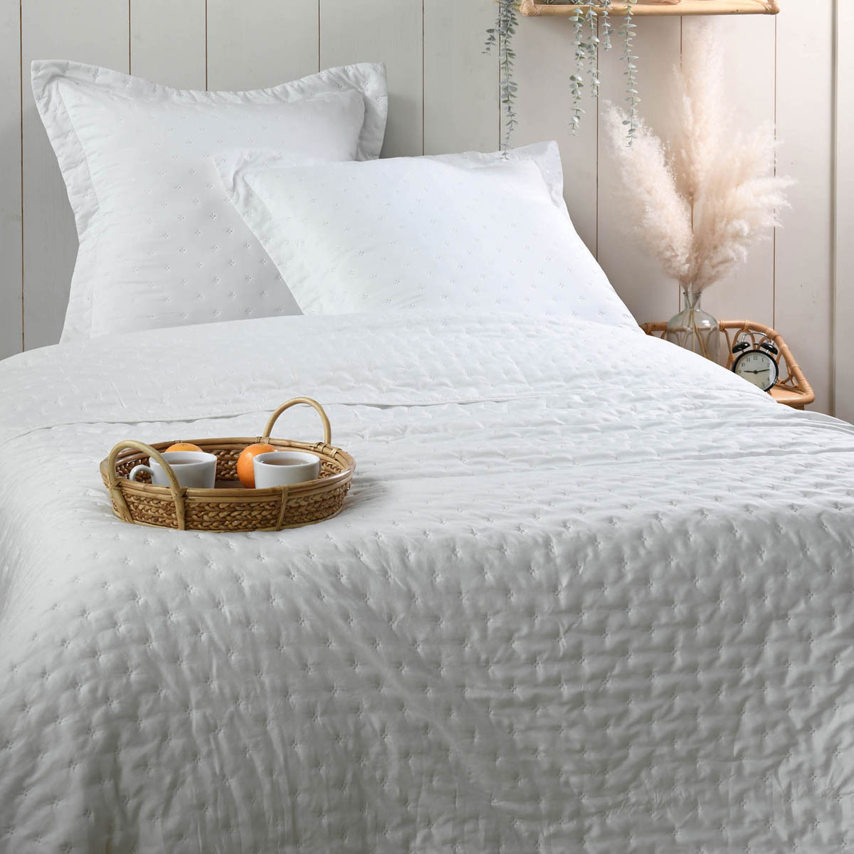 Κουβερλί γίγας και διακοσμητικές μαξιλαροθήκες σε λευκό χρώμα. Κατασκευασμένο από 100% polyester με γέμιση από λεπτή πολυεστερική βάτα. Ιδανικό σκέπασμα για τους ανοιξιάτικους και φθινοπωρινούς μήνες. Έρχονται σε υφασμάτινη συσκευασία στο ίδιο σχέδιο με το κουβερλί.