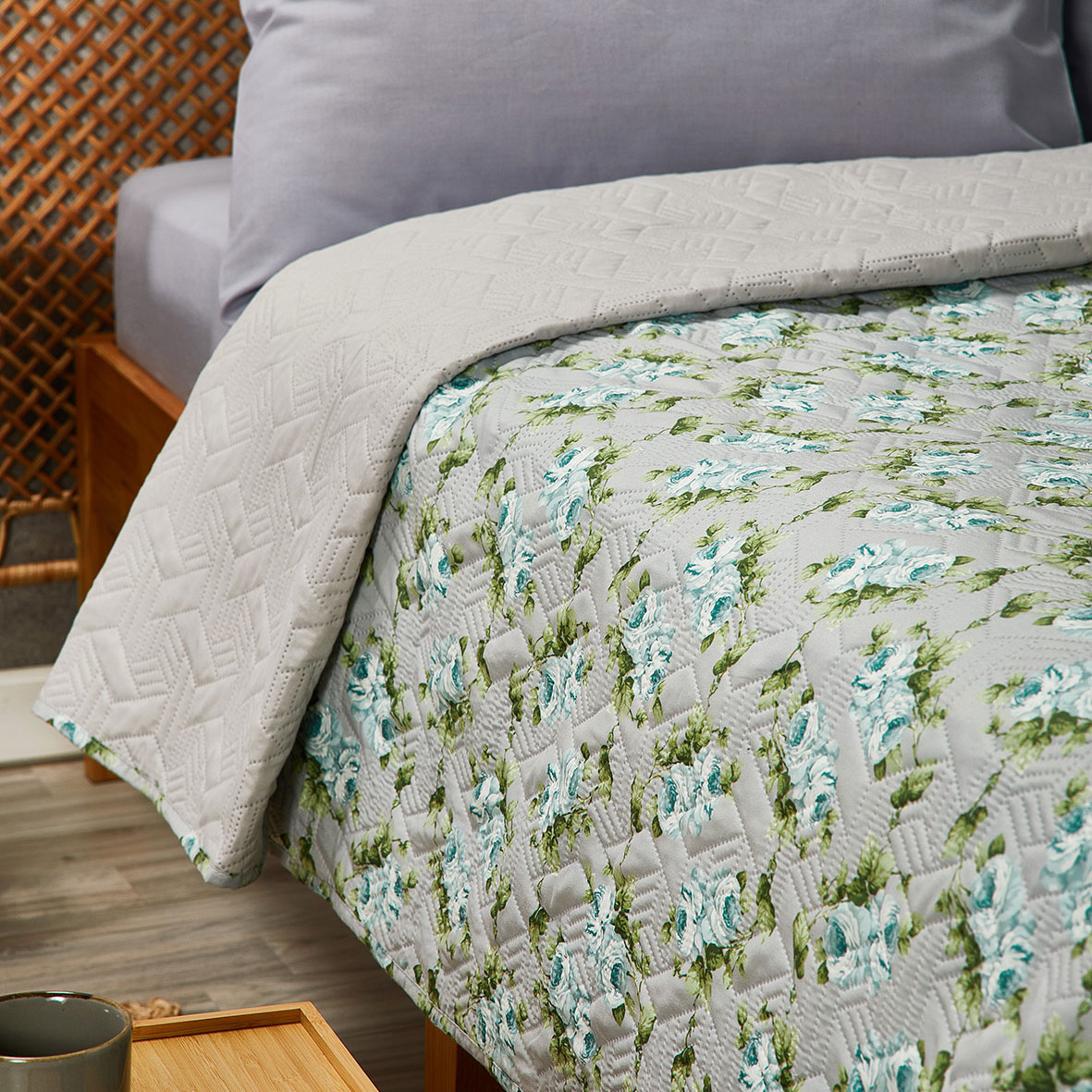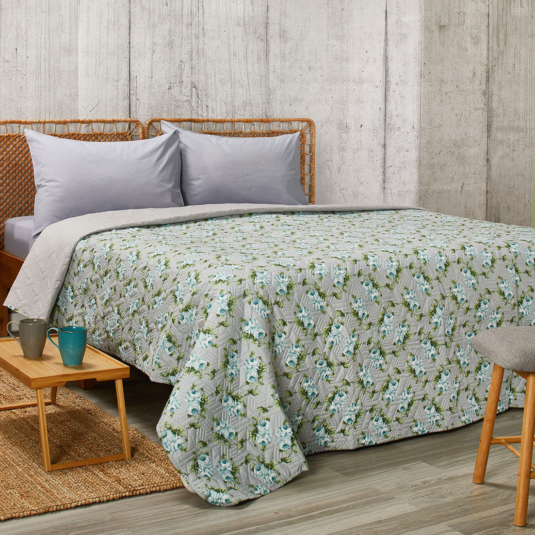 Κουβερλί γίγας διπλής όψης από την εταιρεία Whitegg. Η μία του πλευρά έχει γκρι φόντο και φλοράλ σχέδιο σε γαλάζιες-πράσινες αποχρώσεις ενώ η άλλη είναι μονόχρωμη σε γκρι χρώμα. Το εξωτερικό του ύφασμα είναι από 100% microfiber και η γέμιση από πολυεστερική βάτα. Ιδανικό σκέπασμα για την Άνοιξη και το Καλοκαίρι.