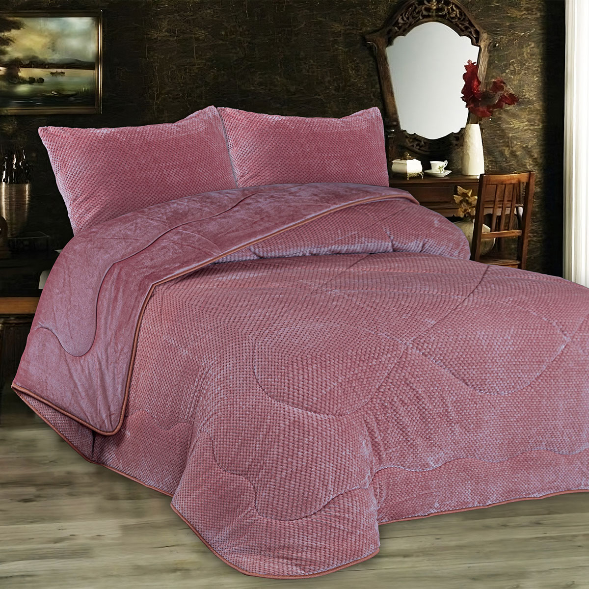 Κουβερτοπάπλωμα μονό στο χρώμα σάπιο μήλο και ανάγλυφο σχέδιο από την εταιρεία Dimcol. Από την μία πλευρά είναι κατασκεπασμένο από 100% polyester με την μια όψη fleece βάρους 200gsm και από την άλλη πλευρά έχει μαλακό fleece βάρους 200gsm. Το γέμισμα είναι από πολυεστερική βάτα βάρους 300gsm. Συνολικό βάρος 700gsm. Ιδανικό σκέπασμα για τους χειμερινούς μήνες.