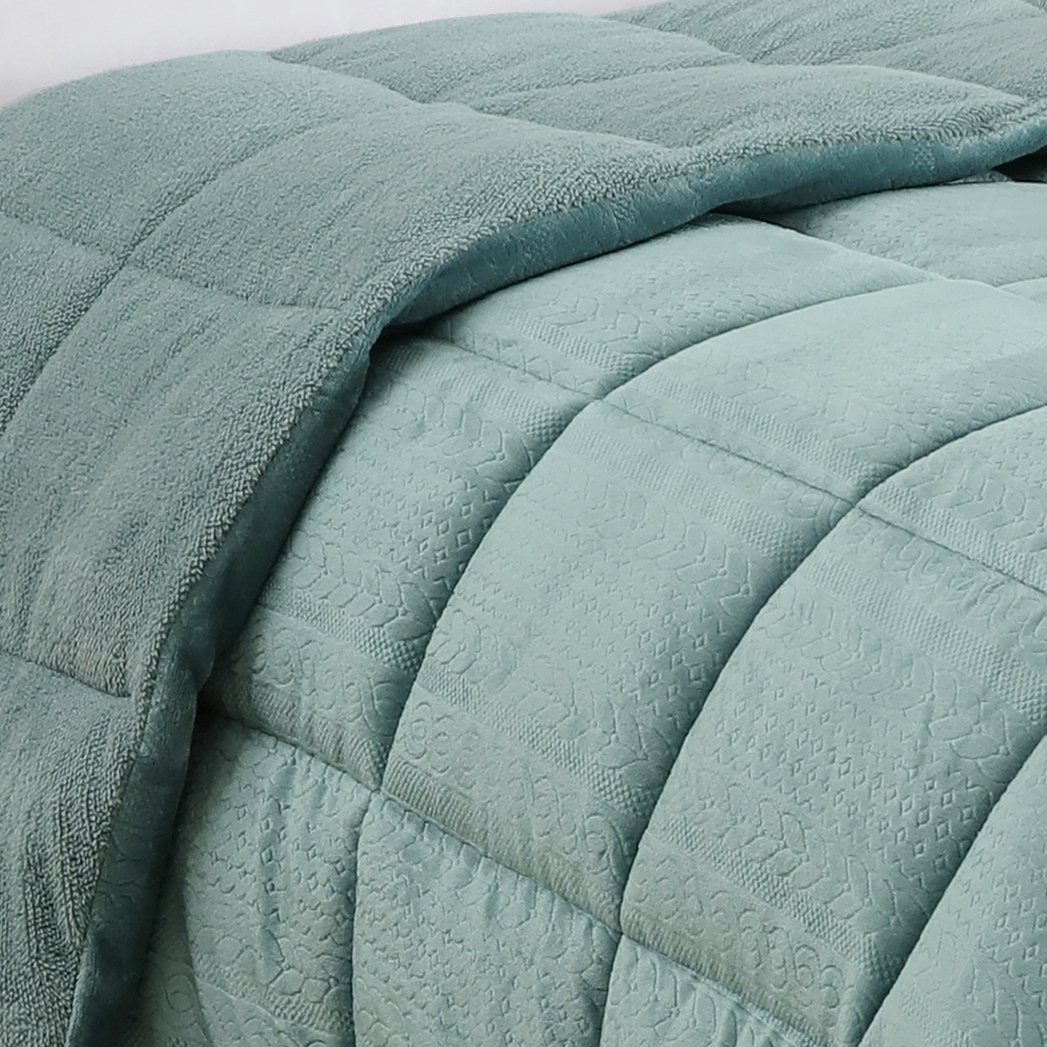 Κουβερτοπάπλωμα μονό της εταιρείας Melinen σε βεραμάν απόχρωση με καπιτονέ επιφάνεια και ανάγλυφο σχέδιο. Από την μία πλευρά είναι κατασκευασμένο από εξαιρετικής ποιότητας ύφασμα flannel polyester βάρους 250gsm και από την άλλη πλευρά από γουνάκι sherpa βάρους 190gsm. Το γέμισμα είναι από 100% hollowfiber βάρους 300gsm. Συνολικό βάρος 740gsm. Ιδανικό σκέπασμα για τους χειμερινούς μήνες.