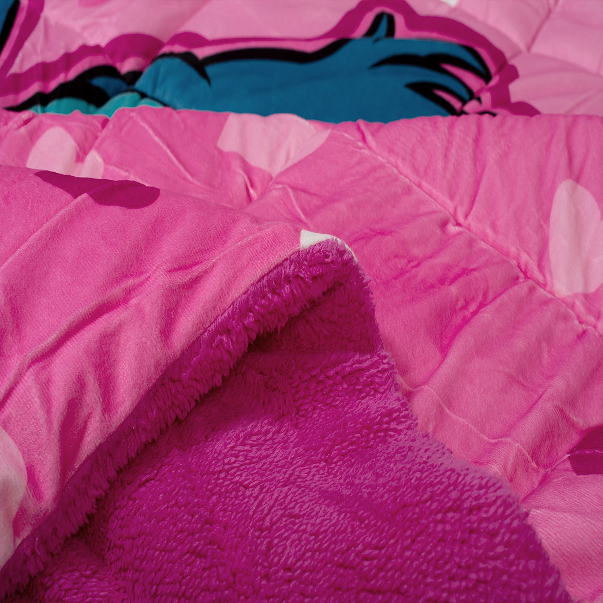 Μονό κουβερτοπάπλωμα από την εταιρεία Dimcol. Η πάνω πλευρά έχει ροζ χρώμα και τον ήρωα από το cartoon Stitch στο σχέδιο. Η άλλη είναι μονόχρωμη σε φούξια χρώμα. Το σχέδιο έχει τυπωθεί με τεχνική ψηφιακής εκτύπωσης. Η μία πλευρά είναι κατασκευασμένη από 100% polyester flannel βάρους 180gsm και η άλλη πλευρά από γουνάκι sherpa βάρους 180gsm. Το γέμισμα είναι από 100% πολυεστερική βάτα βάρους 250gsm. Προσφέρει βελούδινη υφή και ταυτόχρονα μεγαλύτερη θερμική απόδοση από ένα απλό πάπλωμα. Συνολικό βάρος 610gsm. Ιδανικό σκέπασμα για τους χειμερινούς μήνες. Συσκευασία βαλιτσάκι PVC με φερμουάρ και χερούλι.