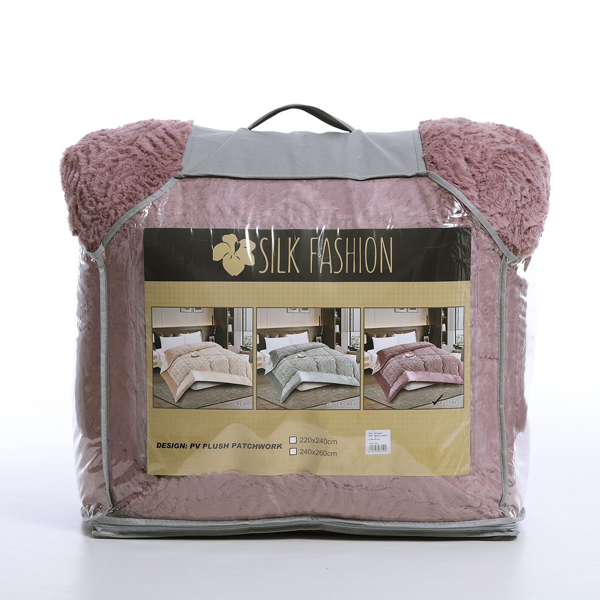 Κουβερτοπάπλωμα γίγας από την εταιρεία Silk Fashion σε σάπιο μήλο χρώμα με ανάγλυφο σχέδιο. Η πάνω πλευρά έχει σύνθεση από 100% polyester, βάρους 240gsm. Η κάτω πλευρά είναι flannel βάρους 200gsm. Η γέμιση είναι από πολυεστερική βάτα βάρους 280gsm. Το συνολικού βάρος του είναι 720gsm που το καθιστά ιδιαίτερα ζεστό για τον χειμώνα.