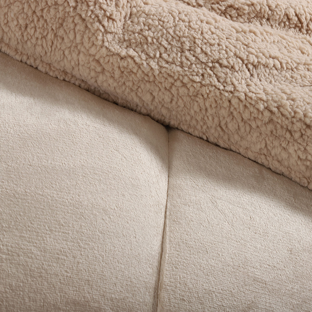 Κουβερτοπάπλωμα γίγας από την εταιρεία Silk Fashion σε μπεζ χρώμα με ανάγλυφο σχέδιο. Η πάνω πλευρά είναι βελουτέ σύνθεσης 100% polyester, βάρους 280gsm. Η κάτω πλευρά είναι γουνάκι sherpa βάρους 200gsm. Η γέμιση είναι από πολυεστερική βάτα βάρους 280gsm. Το συνολικού βάρος του είναι 800gsm που το καθιστά ιδιαίτερα ζεστό για τον χειμώνα.