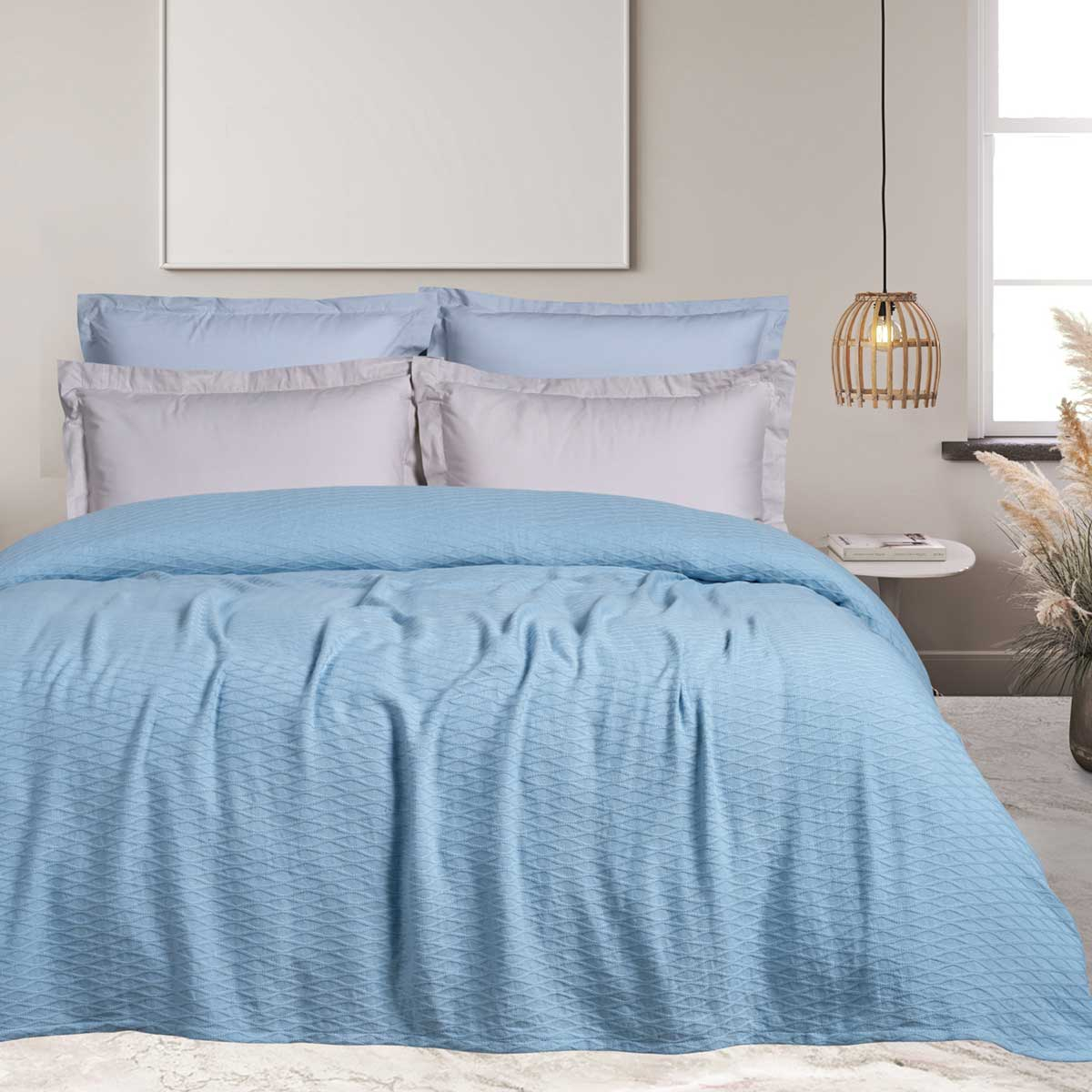 Καλοκαιρινό κουβερτόριο μονή σε γαλάζιο χρώμα και ανάγλυφο σχέδιο από την εταιρεία Das. Κατασκευασμένη από 70% βαμβάκι 30% polyester που την καθιστά ιδιαίτερα απαλή, μαλακή και ανθεκτική στη χρήση. Ιδανικό σκέπασμα για τους καλοκαιρινούς μήνες.