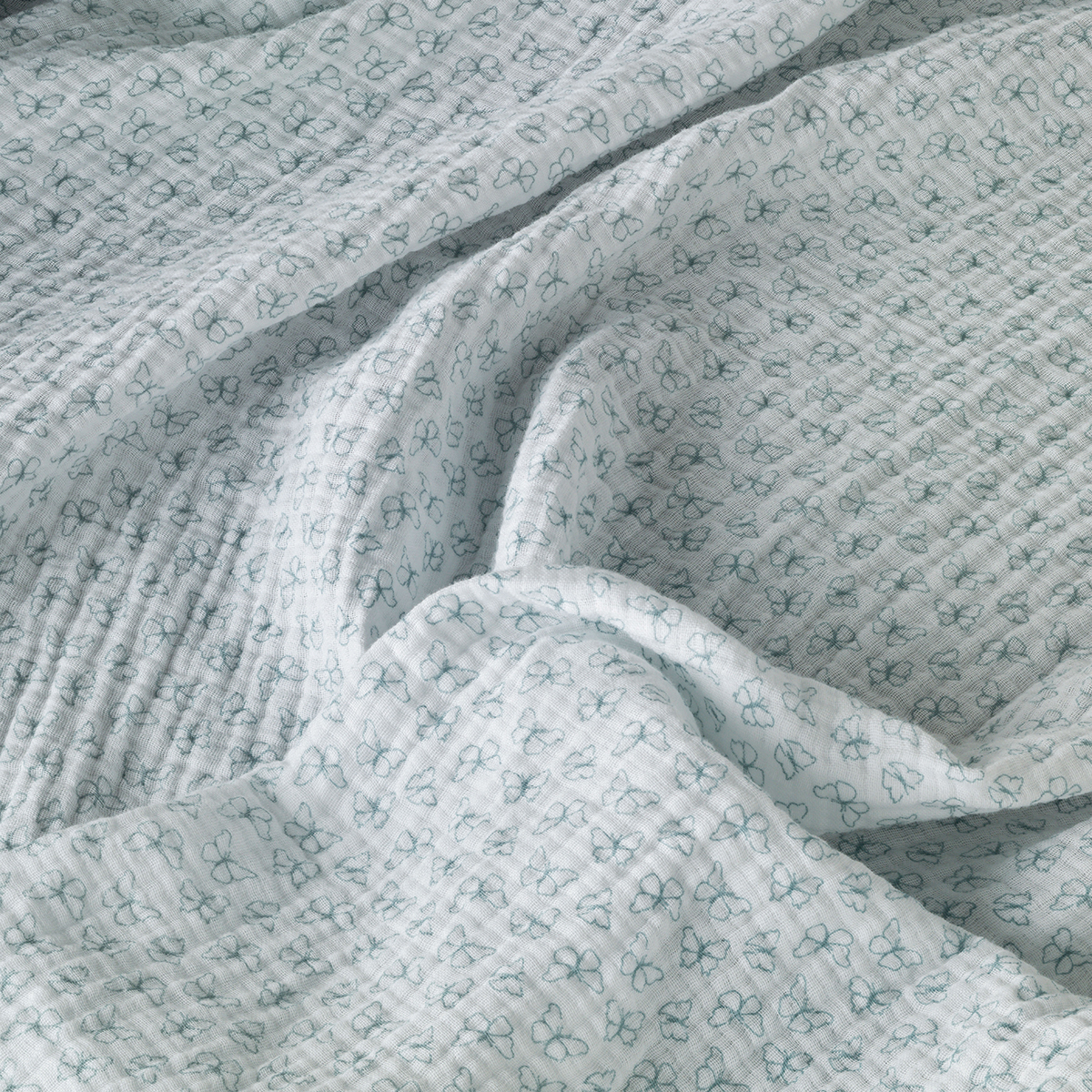 Υπέρδιπλο κουβερτόριο από την εταιρεία Kentia, σε λευκό χρώμα με βεραμάν λεπτομέρειες και σχέδιο με πεταλούδες. Είναι κατασκευασμένο από 100% υψηλής ποιότητας βαμβακερή μουσελίνα 160gsm, ιδανικό για τους ανοιξιάτικους και καλοκαιρινούς μήνες. Το βαμβακερό ύφασμα μουσελίνας ξεχωρίζει για την εξαιρετική απαλότητα, τη δροσερή αίσθηση και την υψηλή διαπνοή του, προσφέροντας άνετο και ευχάριστο ύπνο. Είναι φιλικό προς το δέρμα, κατάλληλο και για ευαίσθητες επιδερμίδες.
