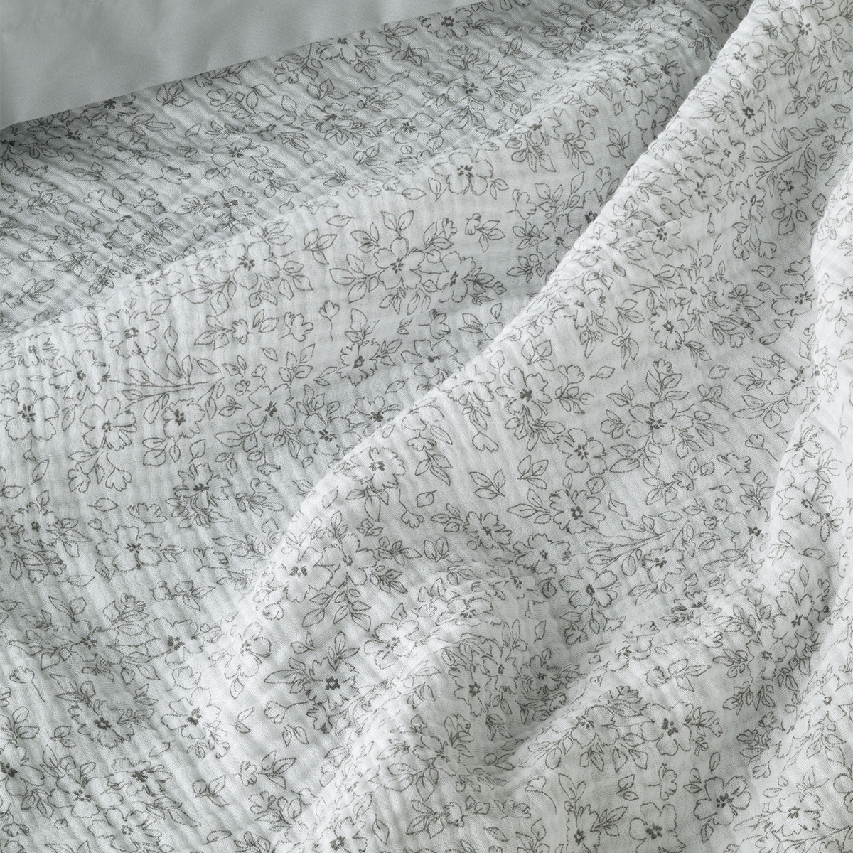 Υπέρδιπλο κουβερτόριο από την εταιρεία Kentia, σε λευκό χρώμα με γκρι φλοράλ σχέδιο. Είναι κατασκευασμένο από 100% υψηλής ποιότητας βαμβακερή μουσελίνα 160gsm, ιδανικό για τους ανοιξιάτικους και καλοκαιρινούς μήνες. Το βαμβακερό ύφασμα μουσελίνας ξεχωρίζει για την εξαιρετική απαλότητα, τη δροσερή αίσθηση και την υψηλή διαπνοή του, προσφέροντας άνετο και ευχάριστο ύπνο. Είναι φιλικό προς το δέρμα, κατάλληλο και για ευαίσθητες επιδερμίδες.