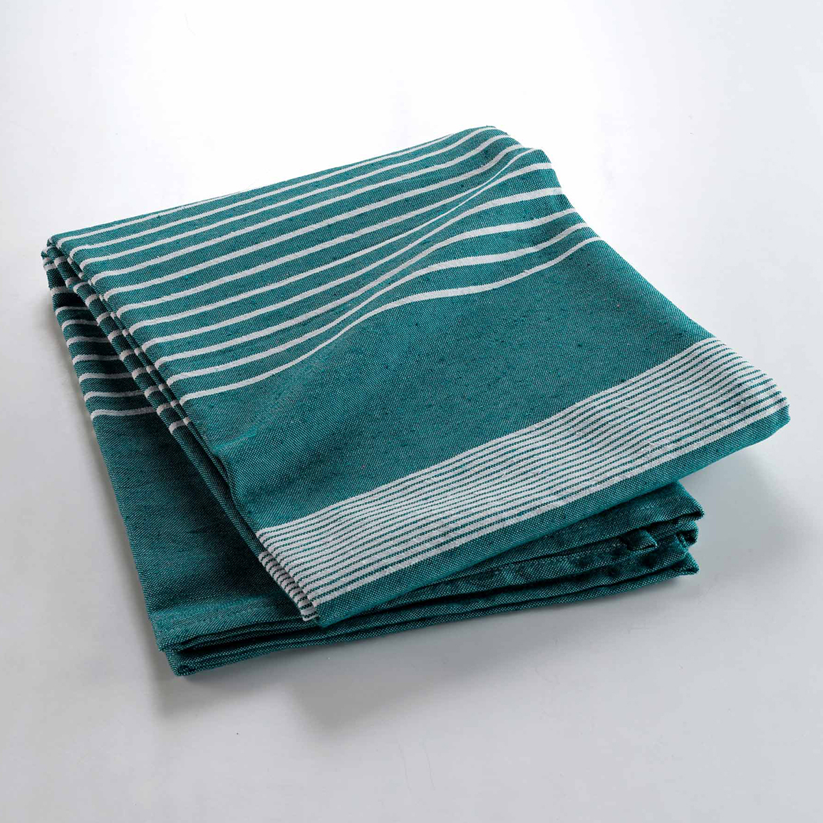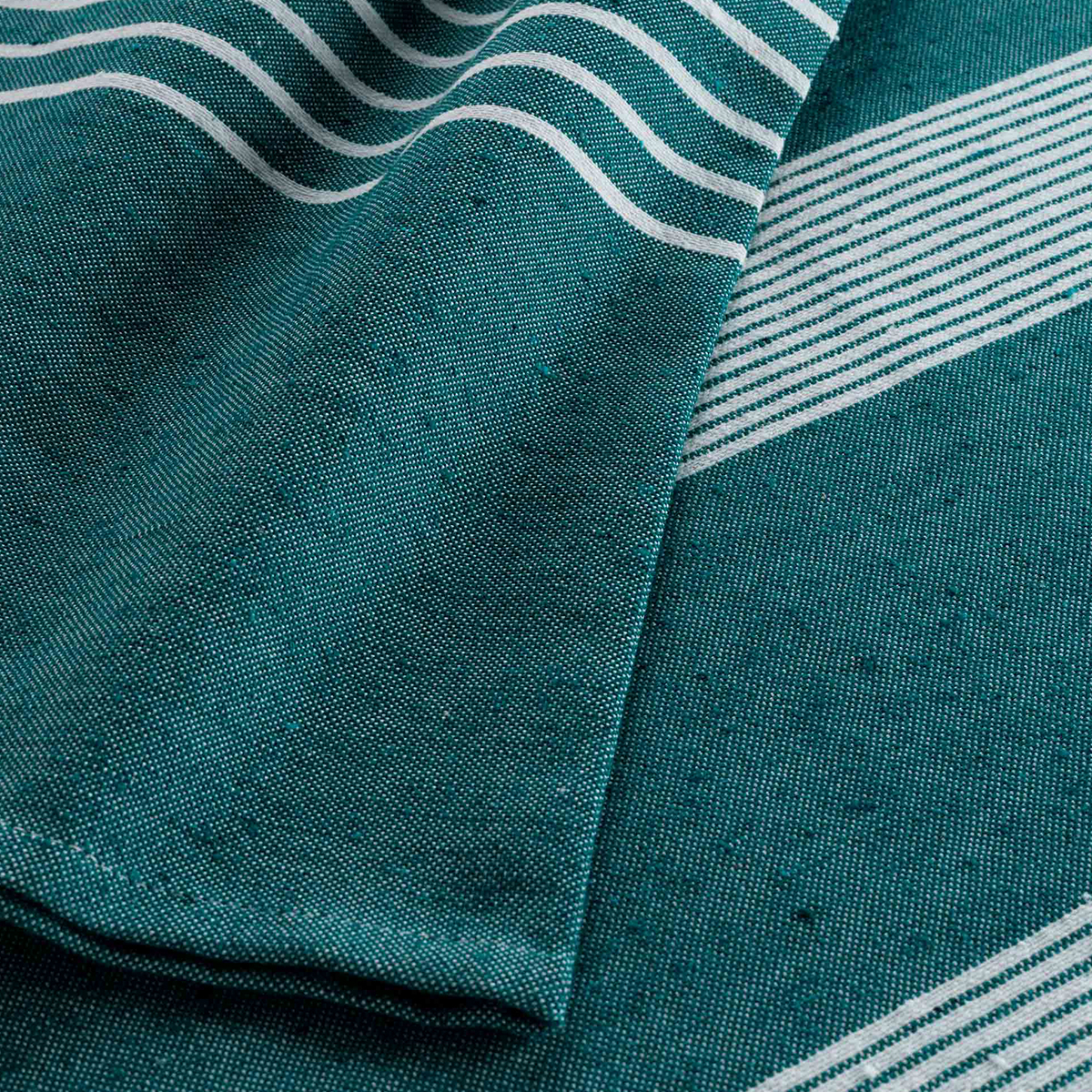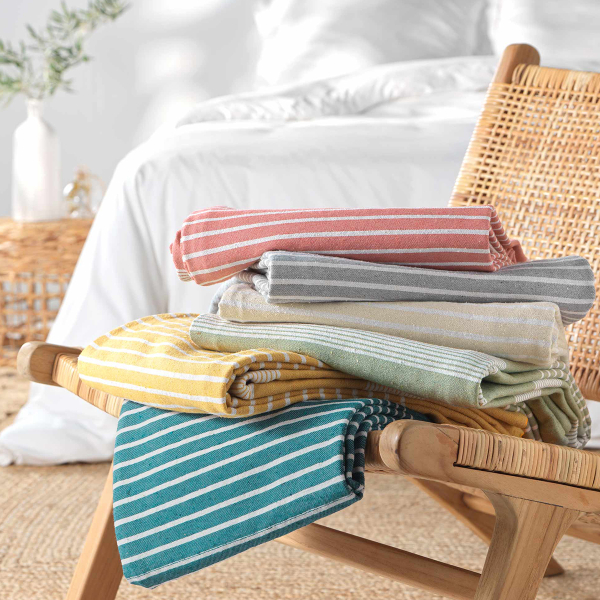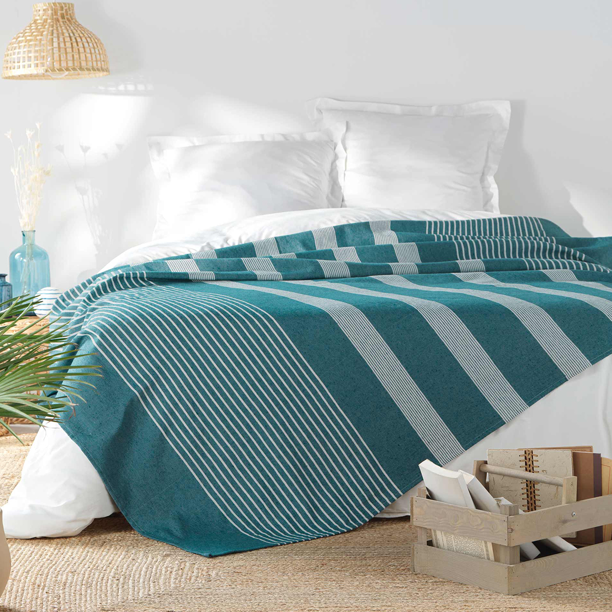 Υπέρδιπλο καλοκαιρινό κουβερτόριο σε πετρόλ χρώμα με ριγέ σχέδιο. Είναι κατασκευασμένο από 87% βαμβάκι και 13% polyester, που το καθιστά ιδανικό σκέπασμα για τους ανοιξιάτικους και καλοκαιρινούς μήνες. Ιδανικό σκέπασμα που μπορεί να χρησιμοποιηθεί και σαν διακοσμητικό στοιχείο στρωμένο στο κρεβάτι σας.