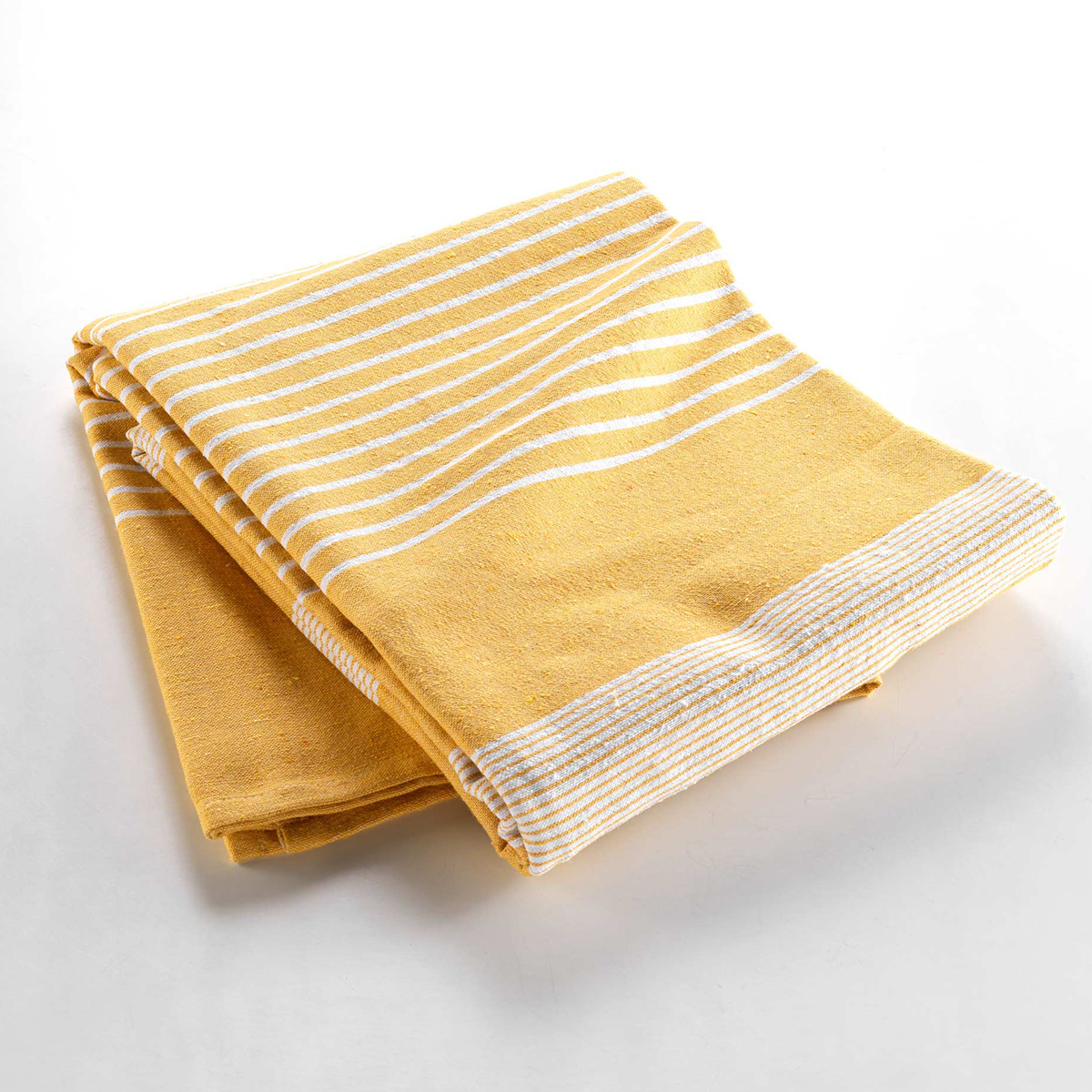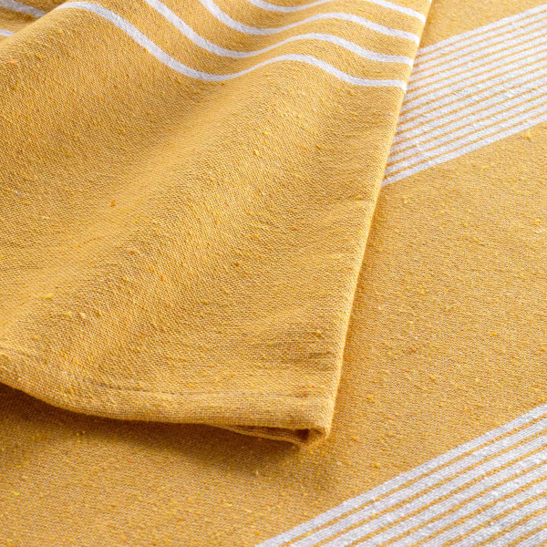Υπέρδιπλο καλοκαιρινό κουβερτόριο σε κίτρινο χρώμα με ριγέ σχέδιο. Είναι κατασκευασμένο από 87% βαμβάκι και 13% polyester, που το καθιστά ιδανικό σκέπασμα για τους ανοιξιάτικους και καλοκαιρινούς μήνες. Ιδανικό σκέπασμα που μπορεί να χρησιμοποιηθεί και σαν διακοσμητικό στοιχείο στρωμένο στο κρεβάτι σας.