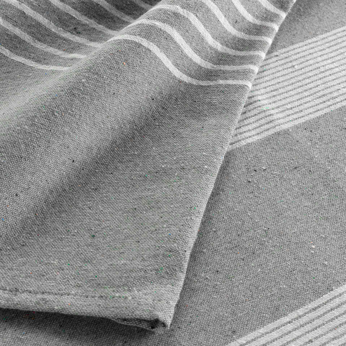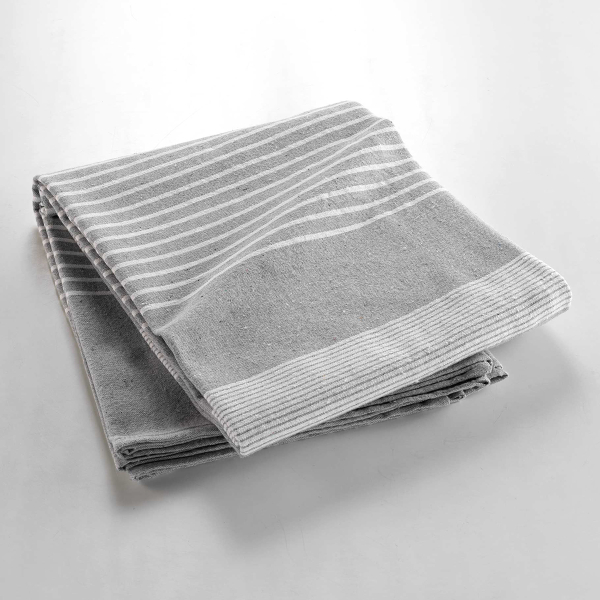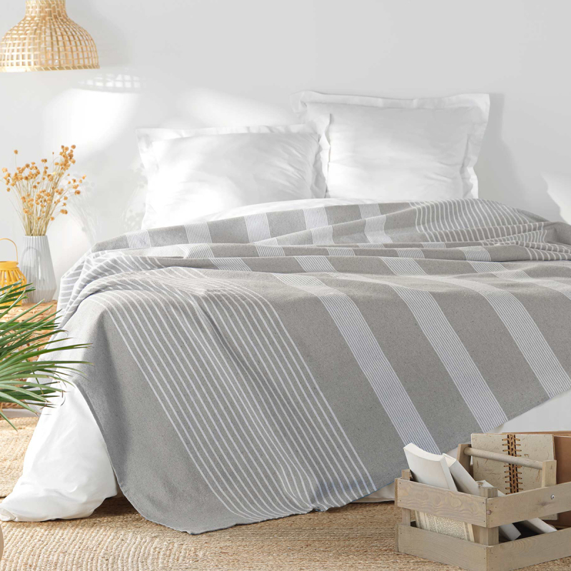 Υπέρδιπλο καλοκαιρινό κουβερτόριο σε γκρι χρώμα με ριγέ σχέδιο. Είναι κατασκευασμένο από 87% βαμβάκι και 13% polyester, που το καθιστά ιδανικό σκέπασμα για τους ανοιξιάτικους και καλοκαιρινούς μήνες. Ιδανικό σκέπασμα που μπορεί να χρησιμοποιηθεί και σαν διακοσμητικό στοιχείο στρωμένο στο κρεβάτι σας.