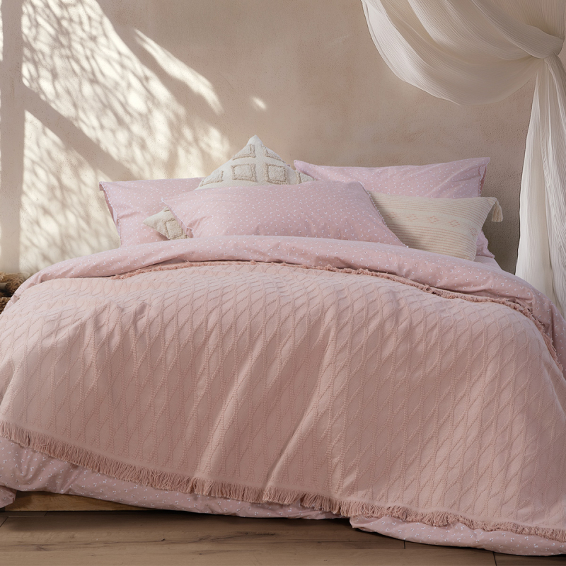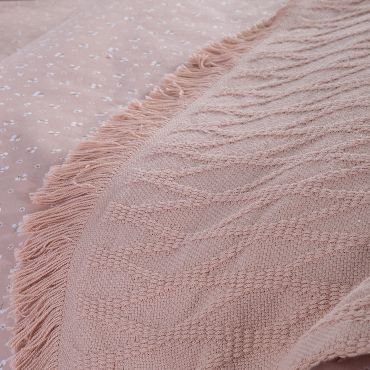 Υπέρδιπλο κουβερτόριο από την εταιρεία Nef-Nef σε ροζ απόχρωση με κρόσσια στο τελείωμα. Είναι κατασκευασμένο από 100% βαμβακερά νήματα πενιέ που προσφέρουν υψηλή ποιότητα και απαλή αίσθηση. Έχει βάρος 340gsm, που το καθιστά ιδανικό σκέπασμα για τους ανοιξιάτικους και καλοκαιρινούς μήνες. Η εταιρεία Nef-Nef διαθέτει πιστοποίηση Oeko-Tex, που εγγυάται ότι τα προϊόντα της είναι απαλλαγμένα από επιβλαβείς χημικές ουσίες.