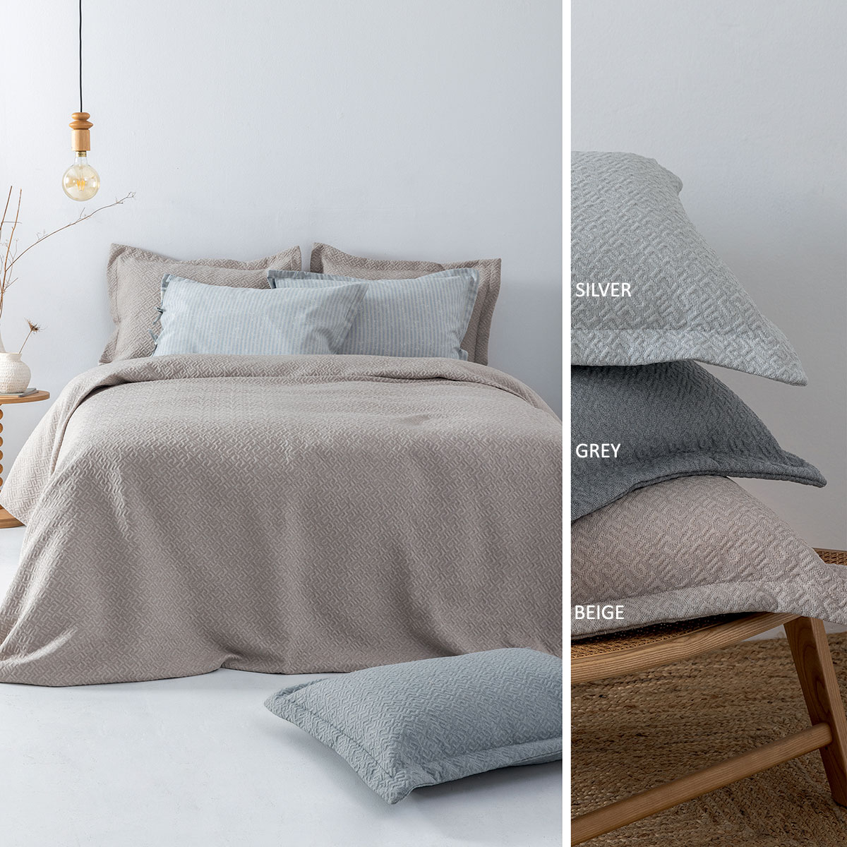Υπέρδιπλο κουβερτόριο από την εταιρεία Palamaiki σε 3 αποχρώσεις. Το ύφασμα είναι ματλασέ με σύνθεση 40% βαμβάκι-60% polyester βάρους 300gsm με ανάγλυφο σχέδιο. Ιδανικό σκέπασμα για τους καλοκαιρινούς μήνες με πολύ απαλή υφή. Συνδυάστε το με τα υπόλοιπα προϊόντα του ίδιου σετ για ένα ολοκληρωμένο αποτέλεσμα.