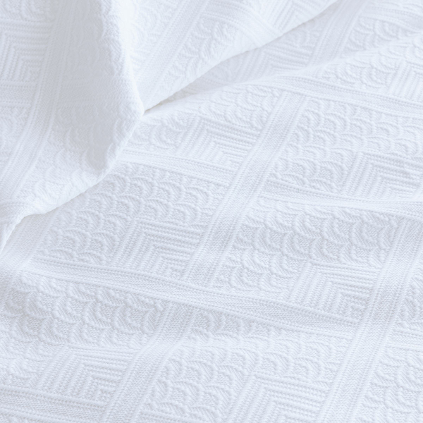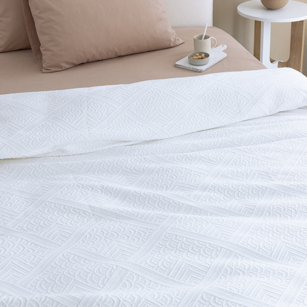 Υπέρδιπλο κουβερτόριο από την εταιρεία Palamaiki. Είναι κατασκευασμένο από 100% βαμβάκι σε λευκό χρώμα με ανάγλυφο σχέδιο. Ιδανικό σκέπασμα για τους καλοκαιρινούς μήνες.