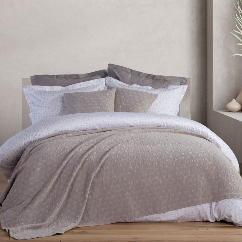 Υπέρδιπλο καλοκαιρινό κουβερτόριο σε μπεζ χρώμα με ανάγλυφο σχέδιο από την εταιρεία Nef-Nef. Κατασκευασμένο από 100% βαμβάκι με δίκλωνα, πολύ απαλά νήματα, βάρους 420gr/m2 και πετροπλυμένο φινίρισμα. Ένα καλοκαιρινό σκέπασμα που μπορεί να χρησιμοποιηθεί και σαν διακοσμητικό στοιχείο στρωμένο στο κρεβάτι σας.