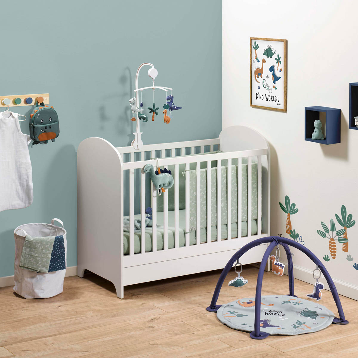 Κουδουνίστρα δεινοσαυράκι σε μπλε χρώμα με βεραμάν λεπτομέρειες. Έχει ιδανικό μέγεθος για τα μικρά χεράκια και κουδουνίζει απαλά σε κάθε κίνηση χάρη στους κρόκους που διαθέτει. Είναι φτιαγμένη από μαλακό υλικό σύνθεσης 100% polyester. Κατάλληλη από την γέννηση.