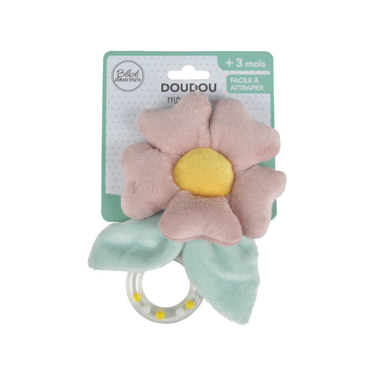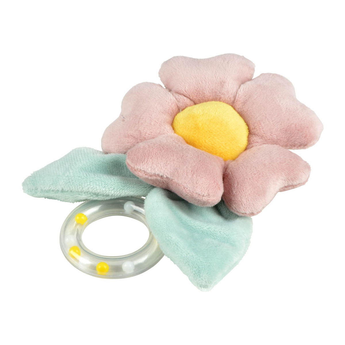 Κουδουνίστρα λουλουδάκι σε ροζ χρώμα με βεραμάν και κίτρινες λεπτομέρειες. Έχει ιδανικό μέγεθος για τα μικρά χεράκια και κουδουνίζει απαλά σε κάθε κίνηση χάρη στους κρόκους που διαθέτει. Είναι φτιαγμένη από μαλακό υλικό σύνθεσης 100% polyester. Κατάλληλη από την γέννηση.