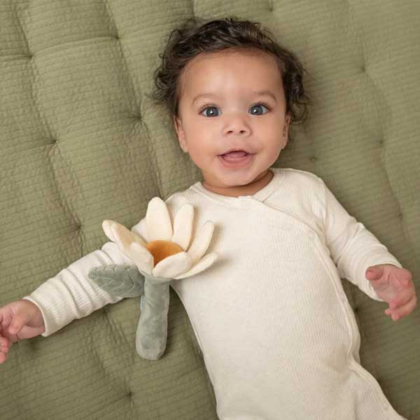 Κουδουνίστρα υφασμάτινη από την εταιρία Little Dutch σε λευκό-γκρι χρώμα και σχήμα λουλούδι. Κατασκευασμένη από 100% polyester που τη καθιστά μαλακή και ανθεκτική. Βοηθάει στην ανάπτυξη του συγχρονισμού χεριών-ματιών και είναι φτιαγμένη από υπέρ-απαλά υλικά για να μπορεί να κρατηθεί εύκολα από τα χεράκια μικρών παιδιών. Πιστοποιημένη με τα ευρωπαϊκά πρότυπα ασφαλείας EN-71-1-2-3. Κατάλληλη για ηλικίες 0+ μηνών.