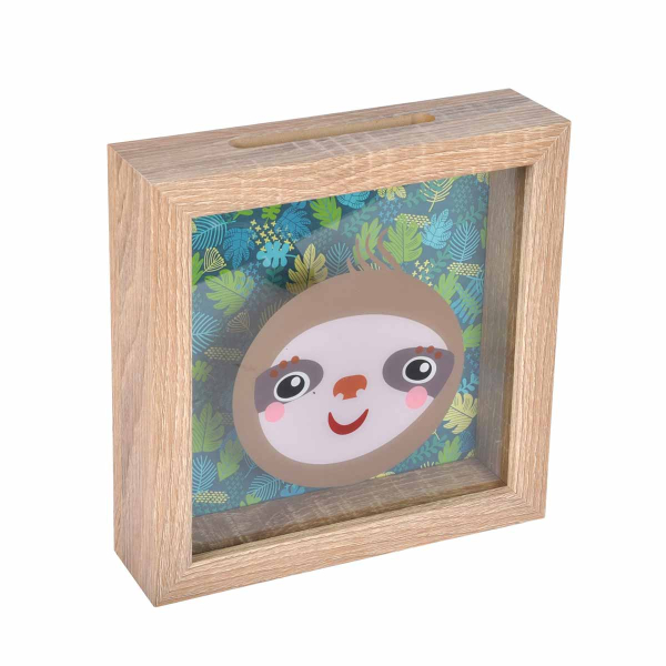 Όμορφος και παιχνιδιάρικος κουμπαράς για τις παιδικές οικονομίες. Είναι κατασκευασμένος από ξύλο σε φυσική απόχρωση και γυαλί. Έχει τροπικό σχέδιο σε πετρόλ χρώμα και ζωάκι. Στο επάνω μέρος διαθέτει εγκοπή για να πέφτουν τα χρήματα.