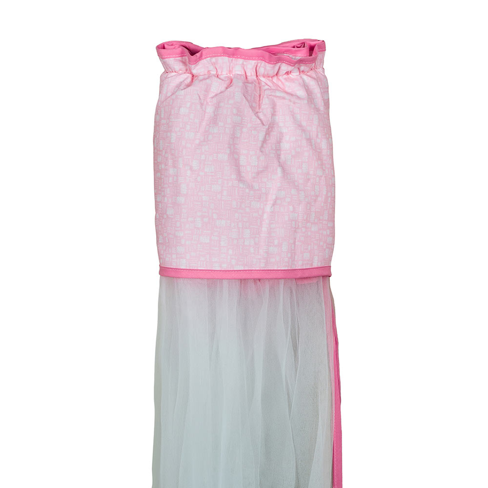 Κουνουπιέρα για την κούνια της εταιρείας Κόσμος του Μωρού. Κατάλληλη για να προστατεύσετε το μωρό σας από τα ενοχλητικά έντομα. Το τούλι είναι κατασκευασμένο από 100% nylon και το καπέλο είναι από 100% βαμβάκι σε ροζ χρώμα με λευκές λεπτομέρειες και τυπωτό μοντέρνο σχέδιο.