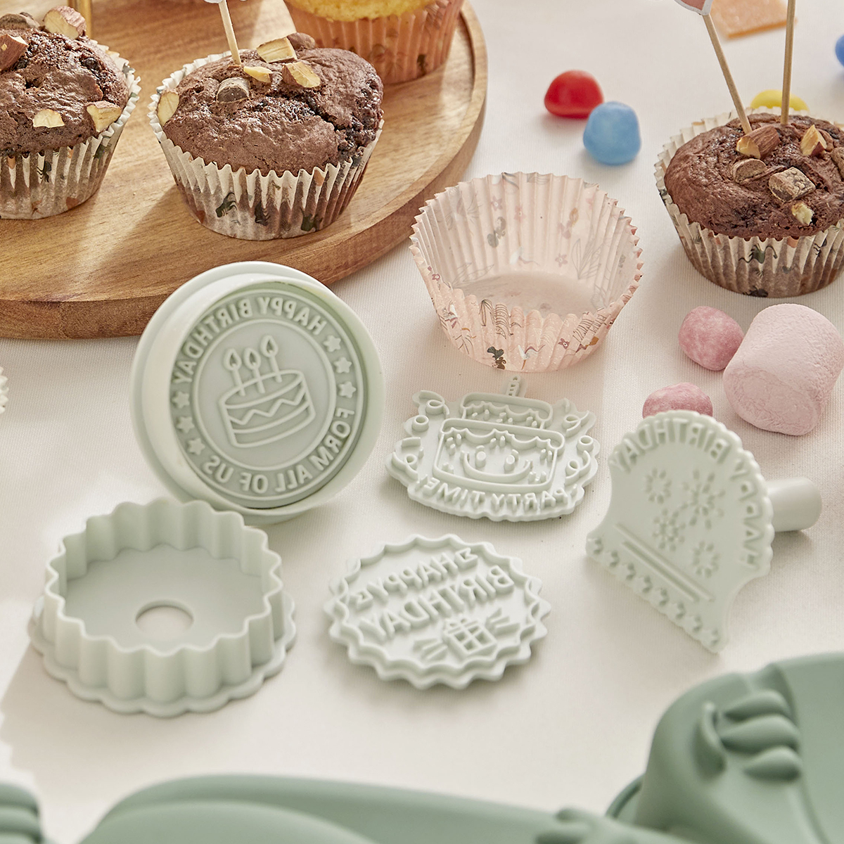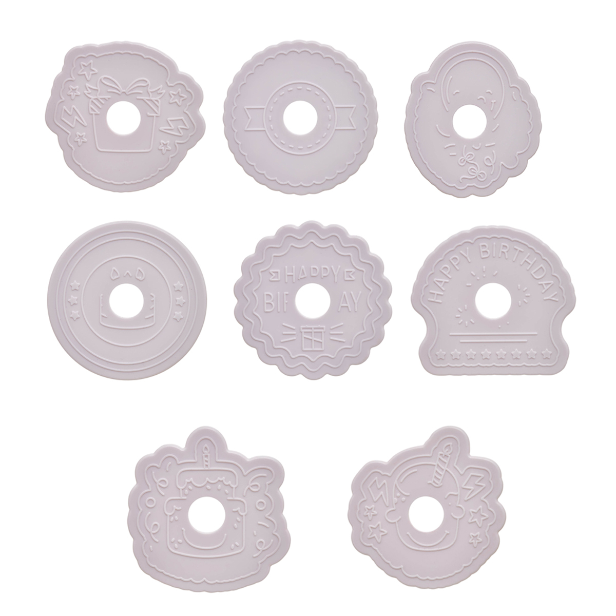 Σφραγίδες ζαχαροπλαστικής με 8 μοναδικά σχέδια γενεθλίων. Είναι παράλληλα και κουπ πατ για να φτιάξετε τα πιο δημιουργικά σχέδια. Ιδανικά για ζύμες, τάρτες, μπισκότα, ζαχαρόπαστα.