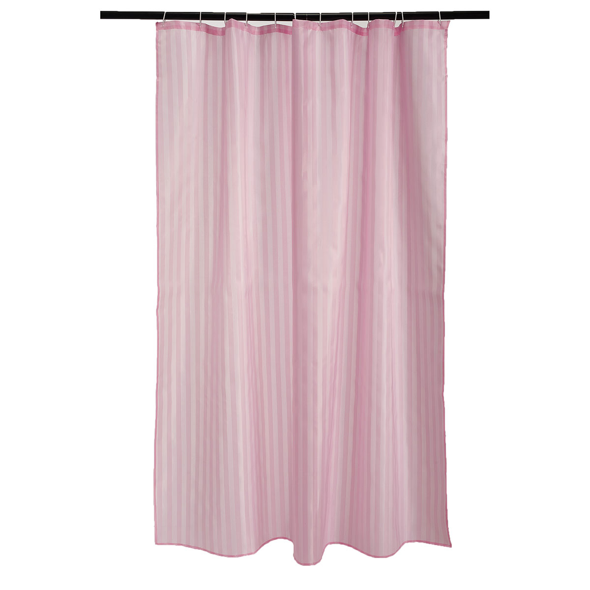 Υφασμάτινη κουρτίνα μπάνιου με διακριτικό ριγέ σχέδιο σε ροζ χρώμα από την εταιρεία Whitegg. Το ύφασμα είναι αδιαβροχοποιημένο, κατασκευασμένο από 100% polyester. Περιλαμβάνονται 12 κρίκοι κρεμάσματος.