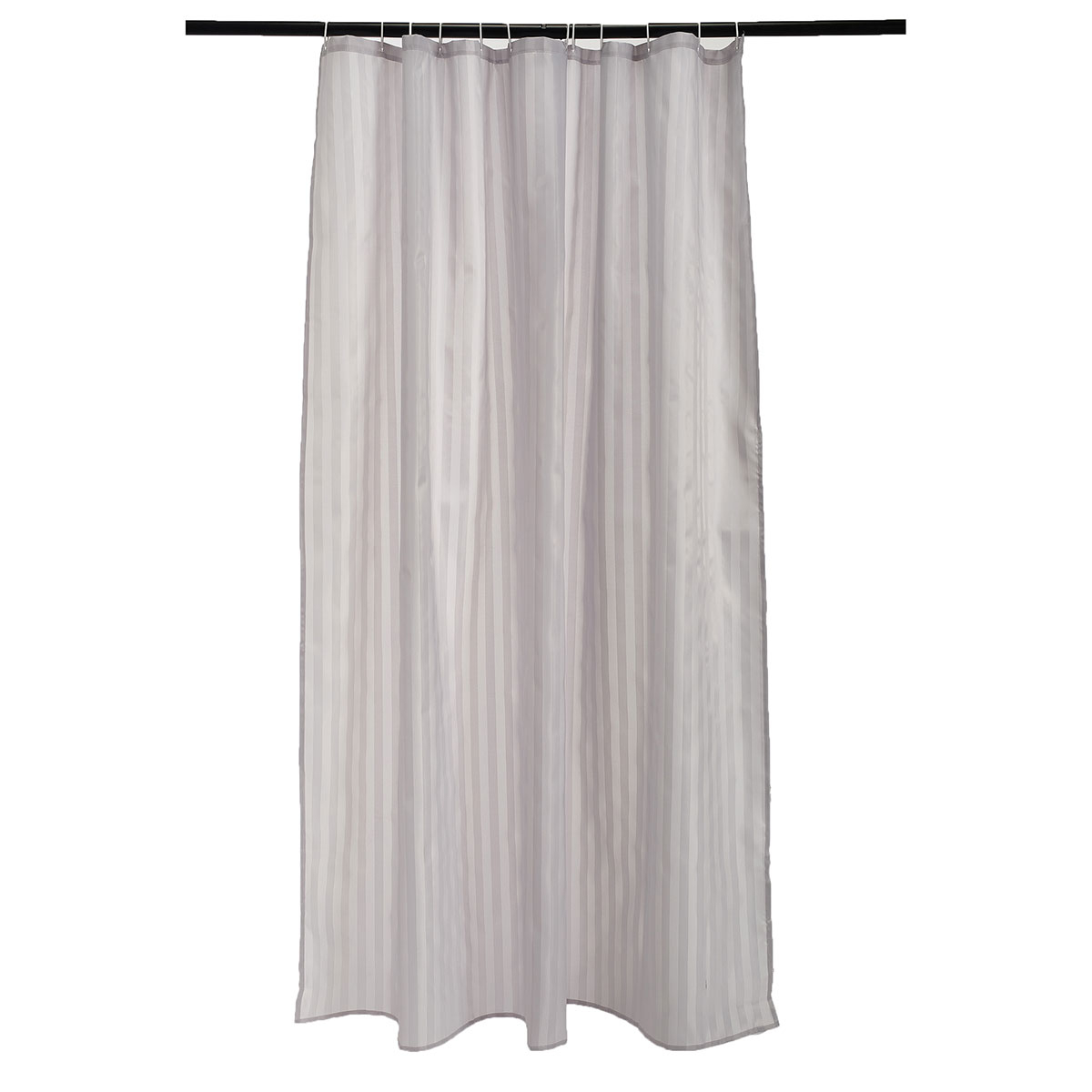 Υφασμάτινη κουρτίνα μπάνιου με διακριτικό ριγέ σχέδιο σε γκρι χρώμα από την εταιρεία Whitegg. Το ύφασμα είναι αδιαβροχοποιημένο, κατασκευασμένο από 100% polyester. Περιλαμβάνονται 12 κρίκοι κρεμάσματος.
