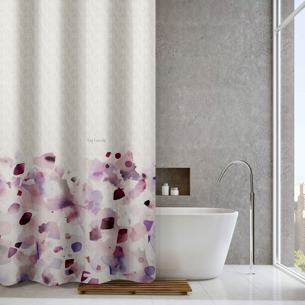 Κουρτίνα μπάνιου 240x185 της εταιρείας Guy Laroche με εκρού φόντο και μοντέρνο σχέδιο σε ροζ-μωβ αποχρώσεις. Είναι κατασκευασμένη από αδιαβροχοποιημένο ύφασμα με σύνθεση 100% polyester. Συνδυάστε την με τα υπόλοιπα προϊόντα της ίδιας σειράς για μια ολοκληρωμένη εμφάνιση στο μπάνιο σας.