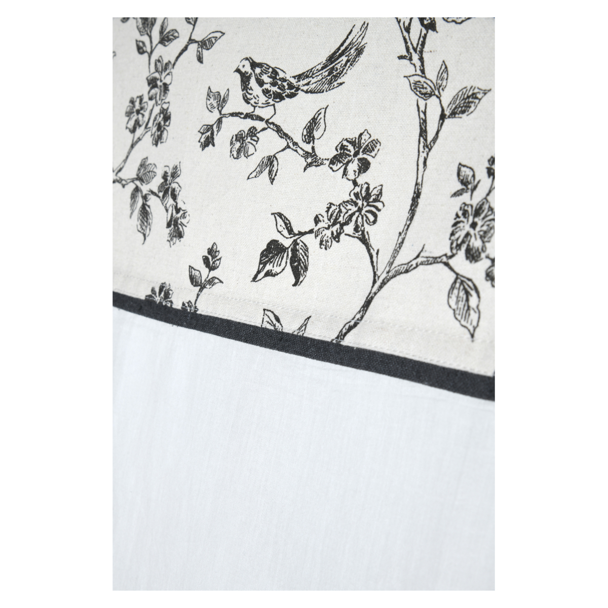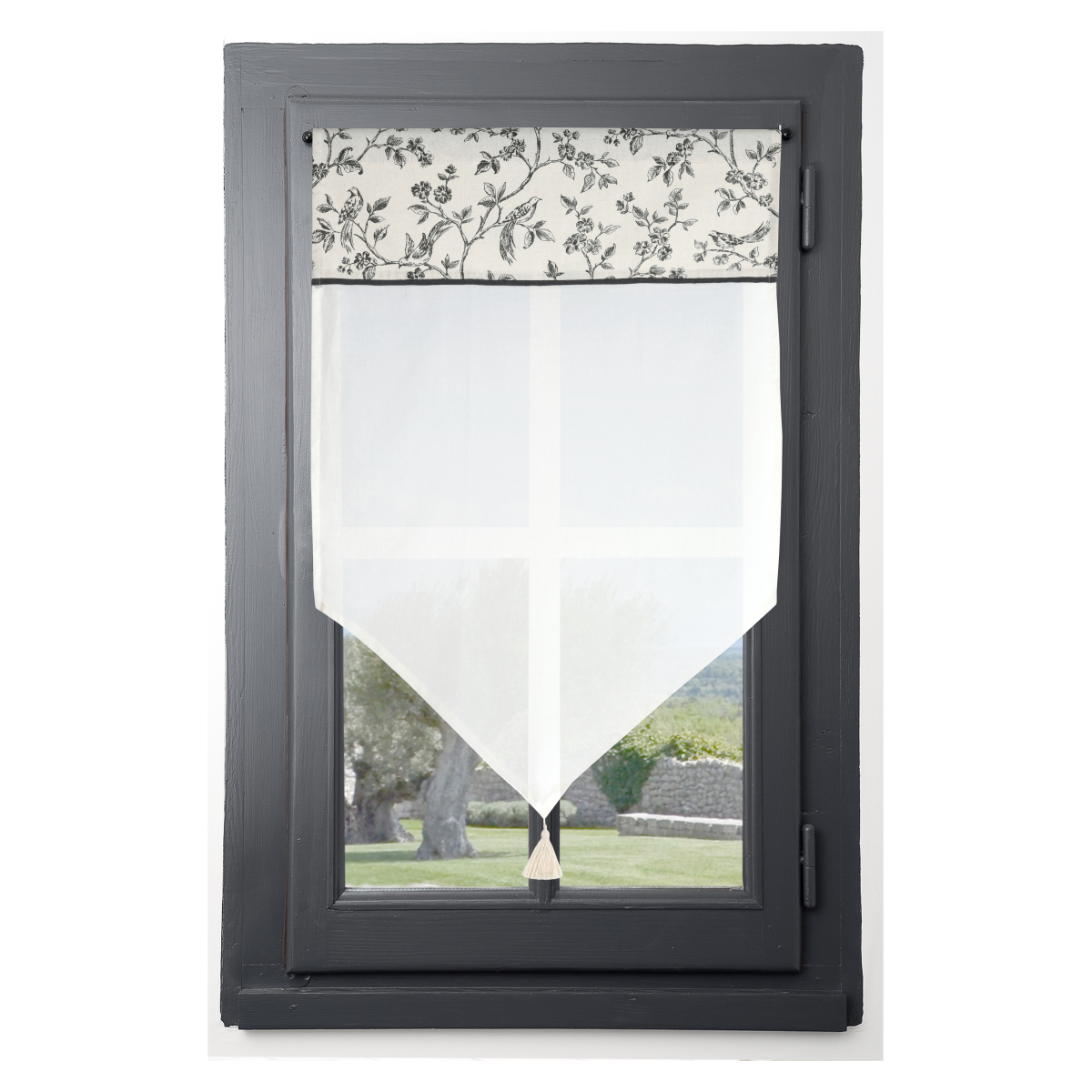 Κουρτίνα 60x90 σε λευκό χρώμα με εκρού-μαύρες λεπτομέρειες. Έχει φάσα με διακριτικό φλοράλ σχέδιο στο πάνω μέρος και διακοσμητικό φουντάκι κάτω. Είναι κατασκευασμένη από 55% ανακυκλωμένο βαμβάκι και 45% ανακυκλωμένο Polyester και είναι χαμηλής σκίασης. Διαθέτει τούνελ που επιτρέπει κατευθείαν την ανάρτηση στο κουρτινόξυλο. Είναι ιδανική για τοποθέτηση στο παράθυρο κουζίνας, στο χωλ ή οποιοδήποτε άλλο χώρο του σπιτιού.