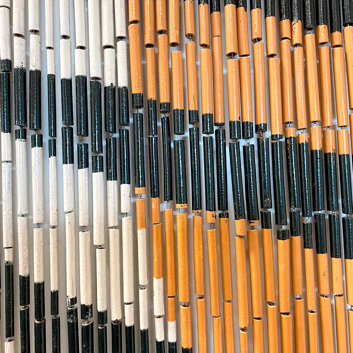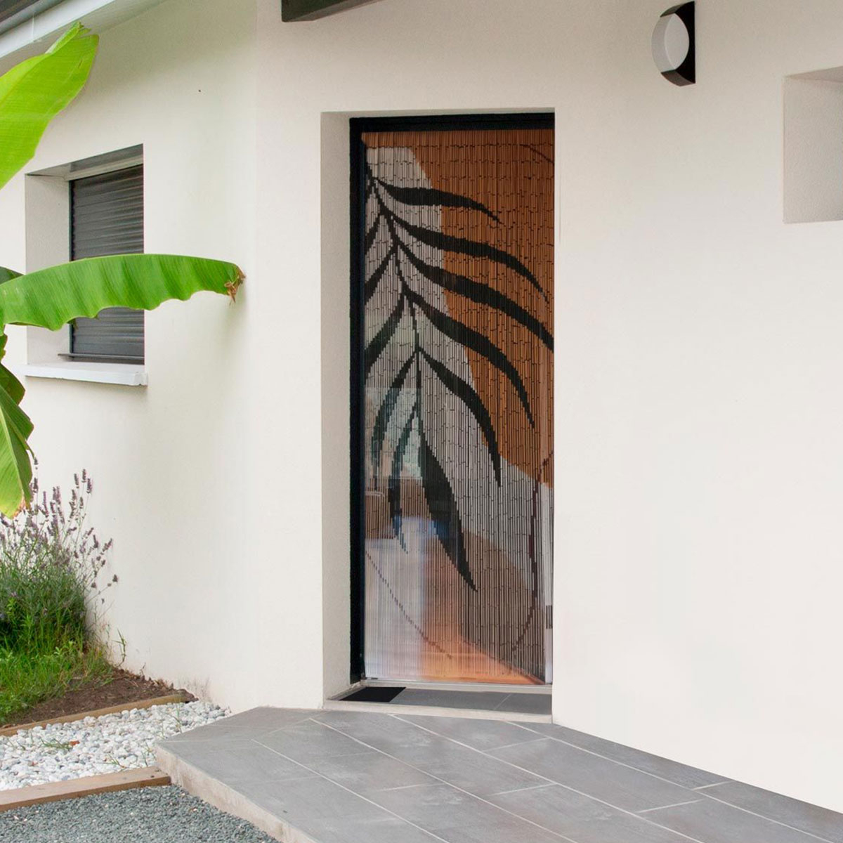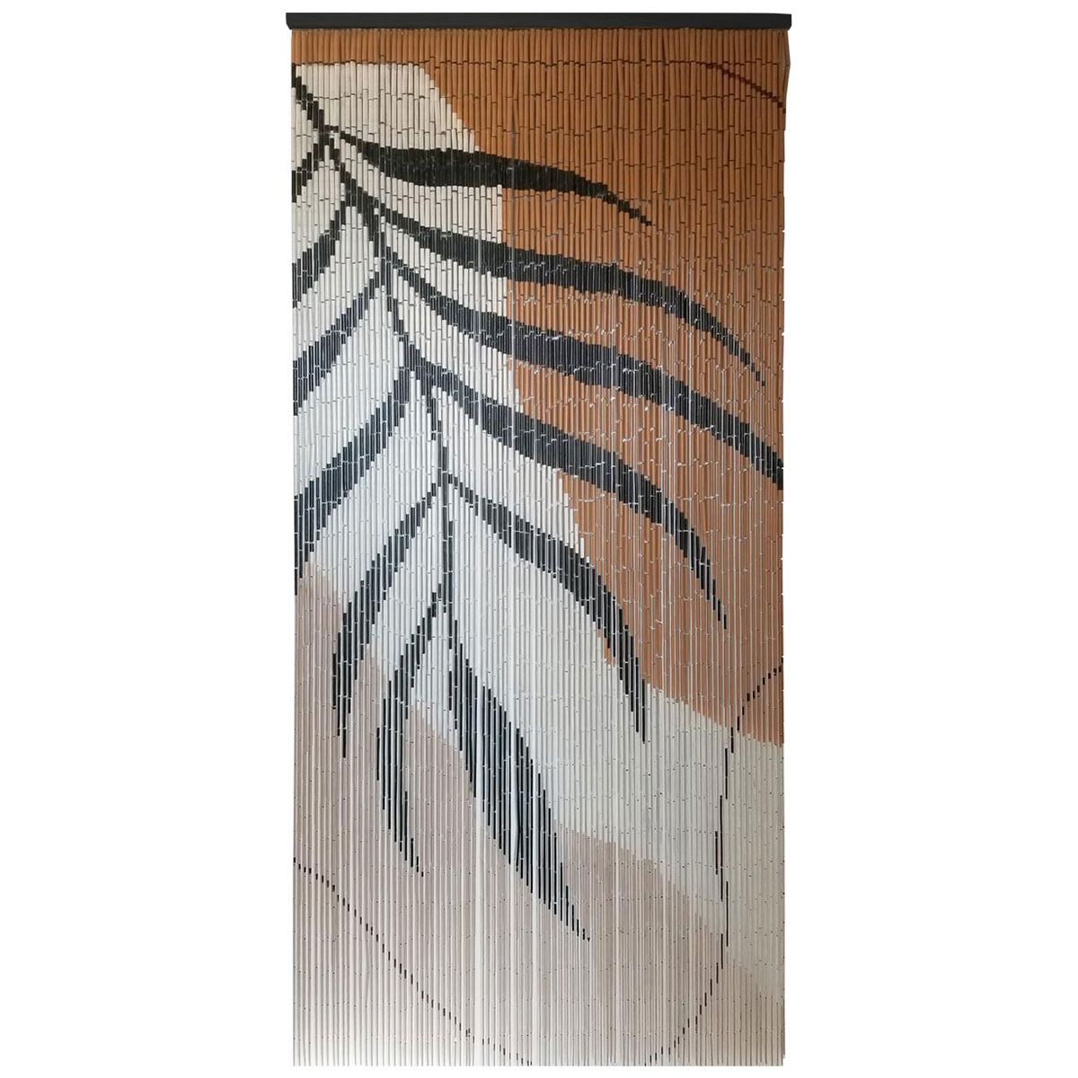 Κουρτίνα πόρτας με σωλήνες από ξύλο bamboo. Η βάση είναι σε μπεζ-εκρού-λευκό χρώμα και έχει μαύρο tropical σχέδιο. Μπορεί να τοποθετηθεί σε πόρτες, εξοχικά, τροχόσπιτα και σκάφη. Είναι ιδανική για χρήση το καλοκαίρι, αλλά και για όλο το χρόνο καθώς δεν επιτρέπει στα έντομα να περάσουν. Μπορείτε να μπείτε και να βγείτε από την πόρτα με άνεση χωρίς να σας ενοχλεί καθώς επίσης μειώνετε η αντηλιά. Εκτός από λόγους διακόσμησης, μπορεί να τοποθετηθεί ώστε να αφήνετε ανοιχτή τη πόρτα και να εισέρχεται ο φρέσκος αέρας και το φως στον εσωτερικό χώρο χωρίς να σας βλέπουν. Διαθέτει γαντζάκια για να την κρεμάσετε στο ταβάνι ή πάνω από την πόρτα.
