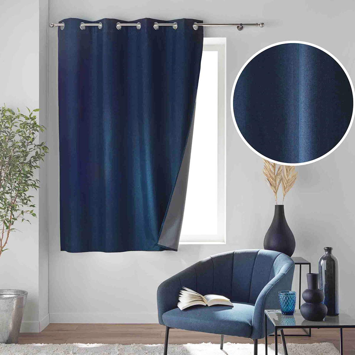 Θερμομονωτική κουρτίνα blackout, ιδανική για τοποθέτηση σε παράθυρο. Είναι κατασκευασμένη από 100% polyester σε σκούρο μπλε χρώμα. Η πίσω όψη της, που έχει κατεύθυνση προς το παράθυρο, έχει fleece επένδυση που προσφέρει μόνωση στη ζέστη και το κρύο. Στο επάνω μέρος διαθέτει τρουκς διαμέτρου 4cm κρεμάσματος για εύκολη τοποθέτηση. Συνδυάστε το χρώμα και το ύφος της κουρτίνας με τον χώρο σας και ανανεώστε την διακόσμησή του.
