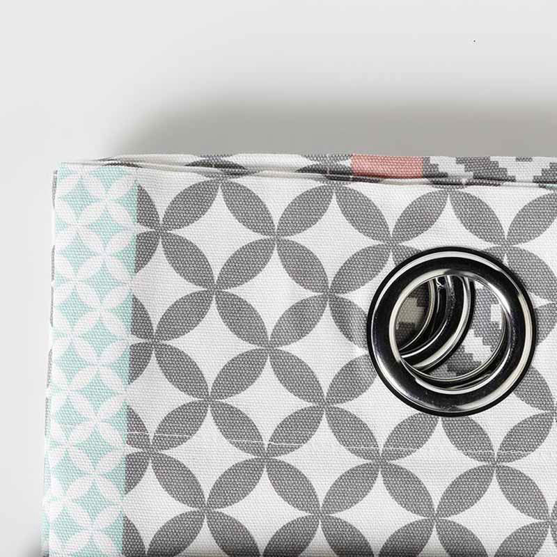 Κουρτίνα με γεωμετρικό μοτίβο σε γκρι, βεραμάν και ροζ χρώματα. Το ύφασμα είναι 100% βαμβάκι υψηλής σκίασης. Στο επάνω μέρος έχει τρουκς κρεμάσματος με διάμετρο 4cm.