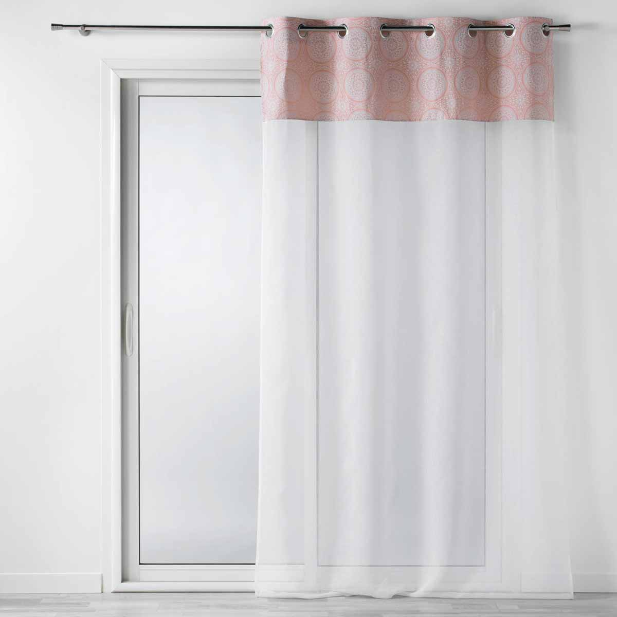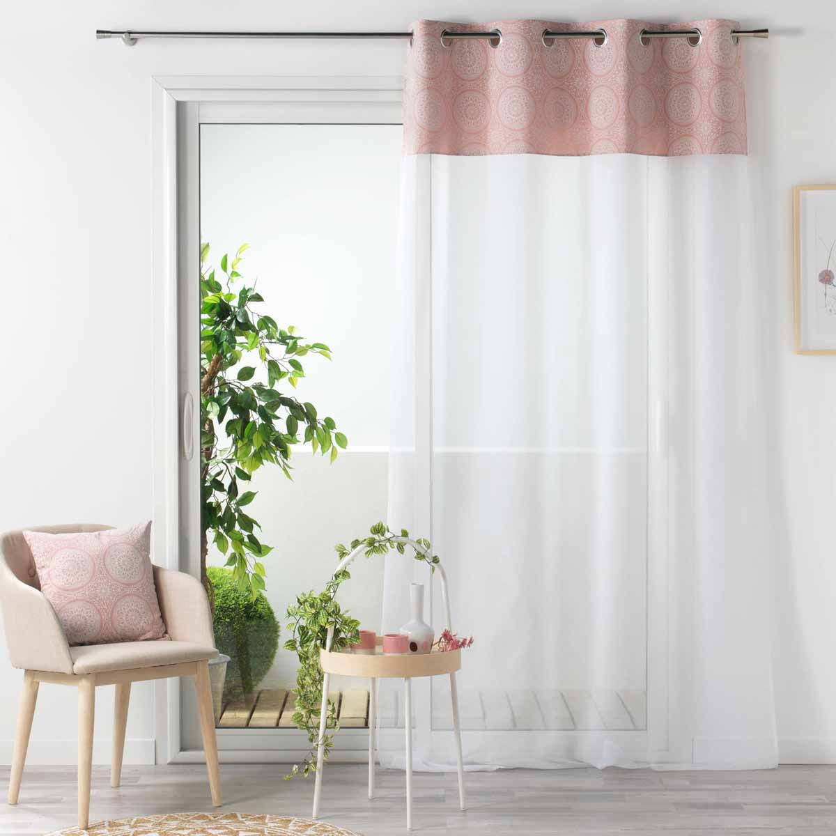 Κουρτίνα χαμηλής σκίασης με τρουκς διαμέτρου 4cm. Το ύφασμα είναι βουάλ 100% polyester σε λευκή απόχρωση. Η φάσα της κορυφής είναι 100% βαμβακέρο ύφασμα σε ροζ απόχρωση με έθνικ σχέδιο.