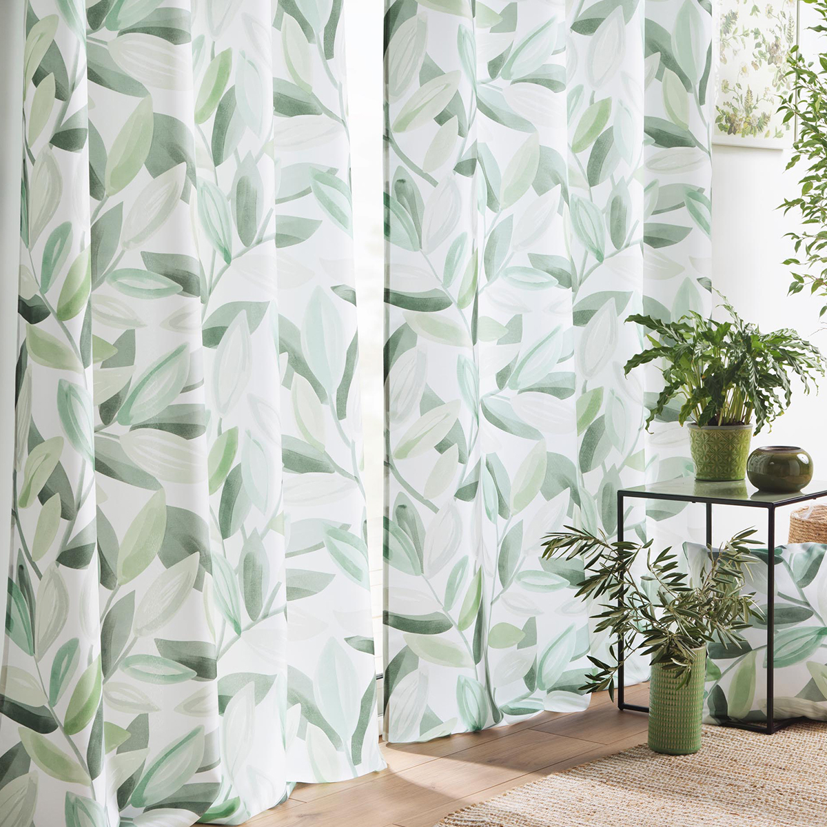 Κουρτίνα σε λευκό χρώμα με πράσινο tropical σχέδιο. Είναι κατασκευασμένη από ύφασμα 100% polyester. Το ύφασμα είναι μέτριας σκίασης που προσφέρει προστασία από το φως, χωρίς να σκοτεινιάζει πλήρως το δωμάτιο. Παράλληλα, διατηρεί την ιδιωτικότητα και επιτρέπει τη ροή του αέρα. Στο επάνω μέρος έχει 8 τρουκς κρεμάσματος με διάμετρο 4cm. Συνδυάστε το χρώμα και το ύφος της κουρτίνας με τον χώρο σας και ανανεώστε την διακόσμησή του.